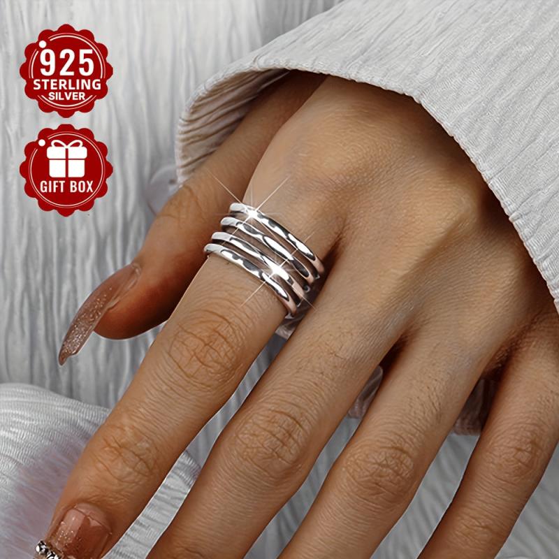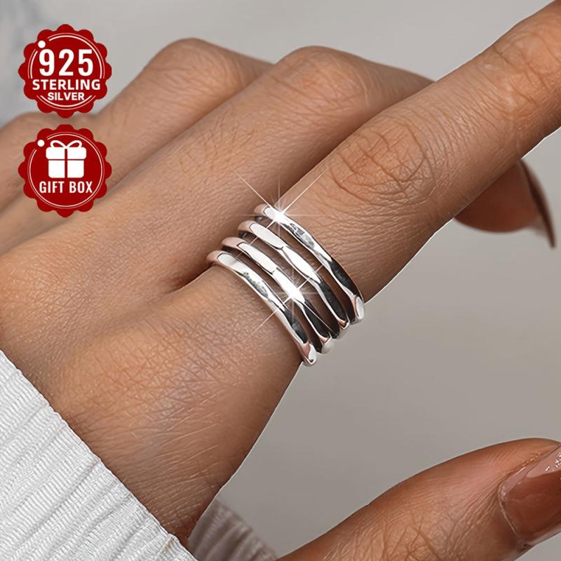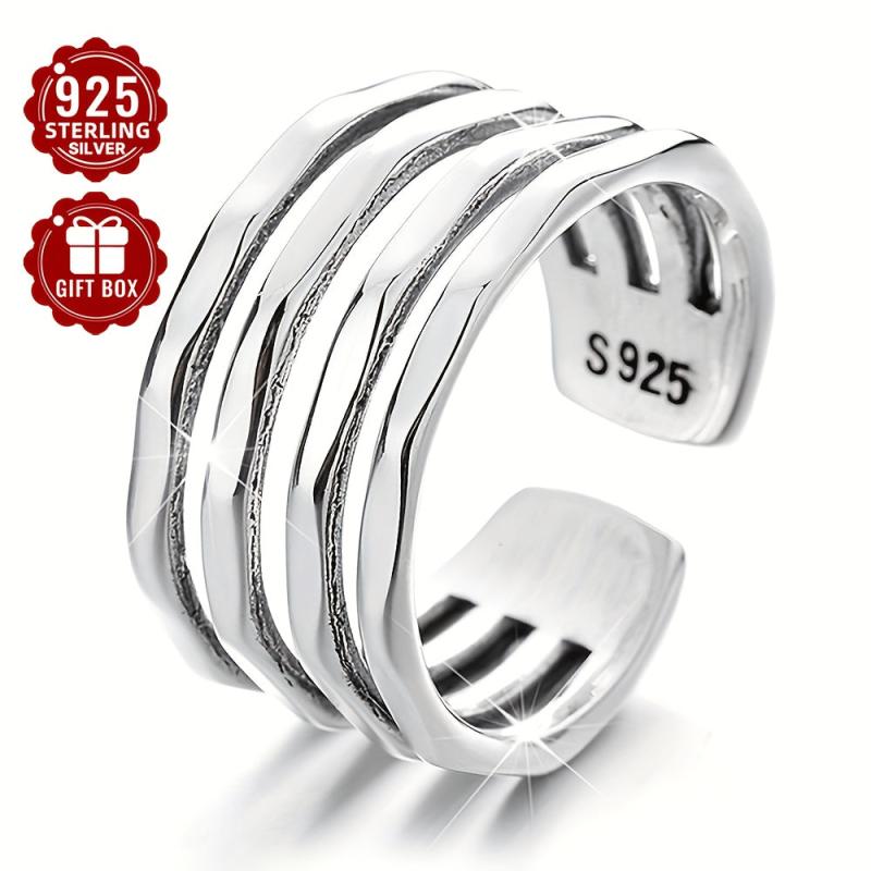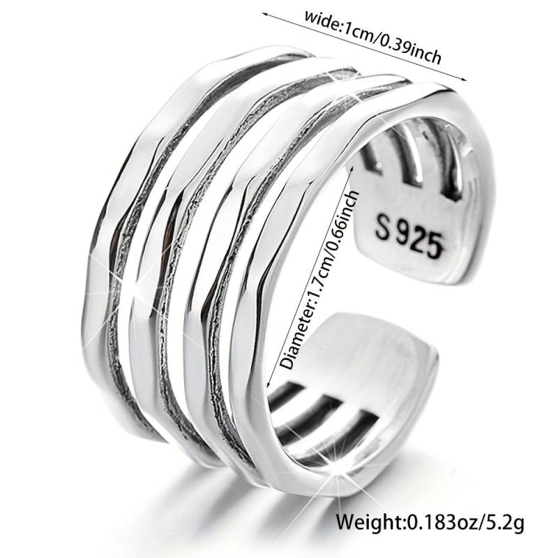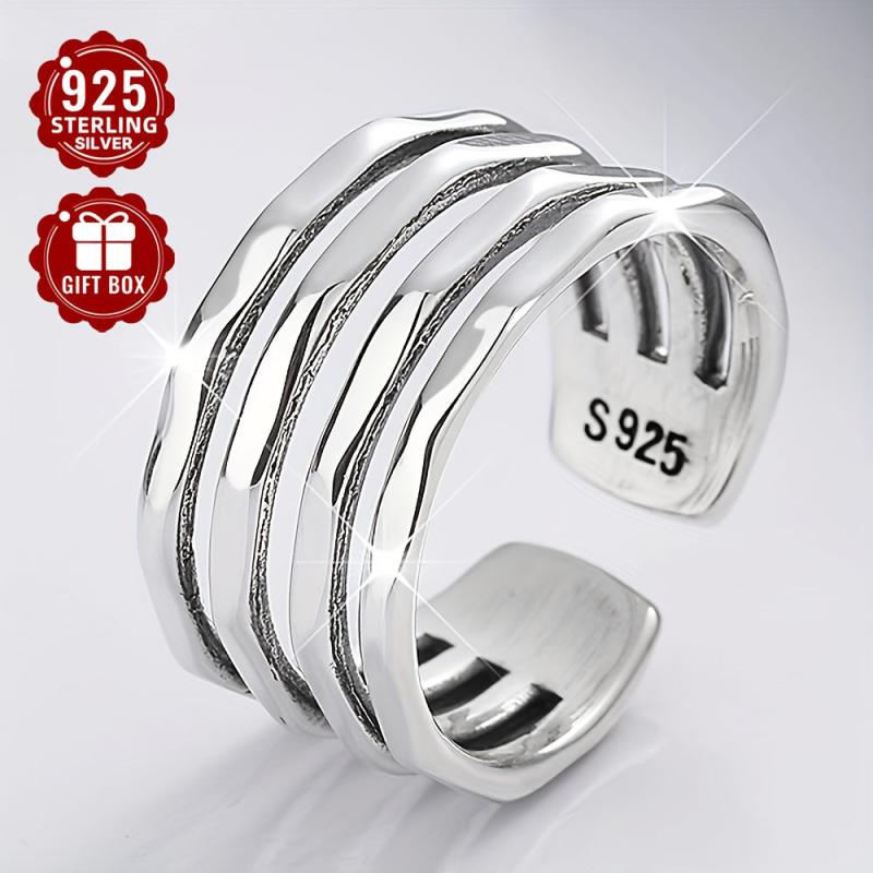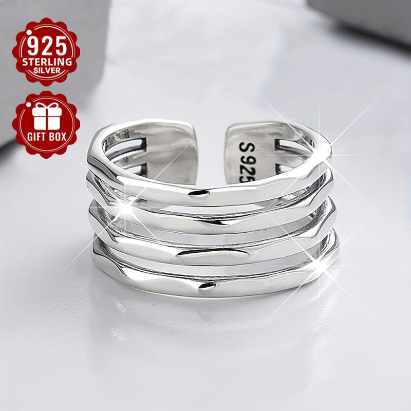 925 Pure Silvery Wide Face Ring for Women, Adjustable Retro Irregular Layer Ring