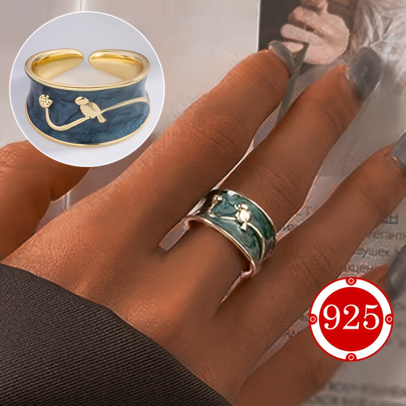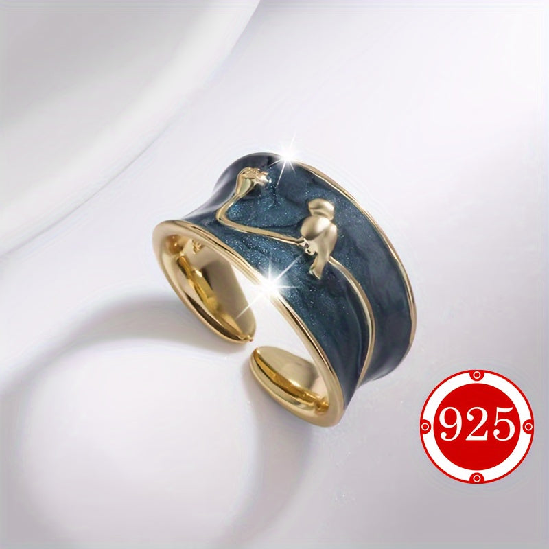 This stunning 925 sterling silver ring features a wide band with a branch and bird design. The intricate details make it a unique and eye-catching piece for any bird lover.