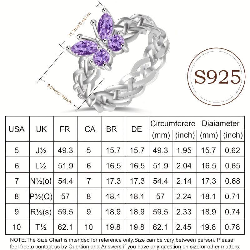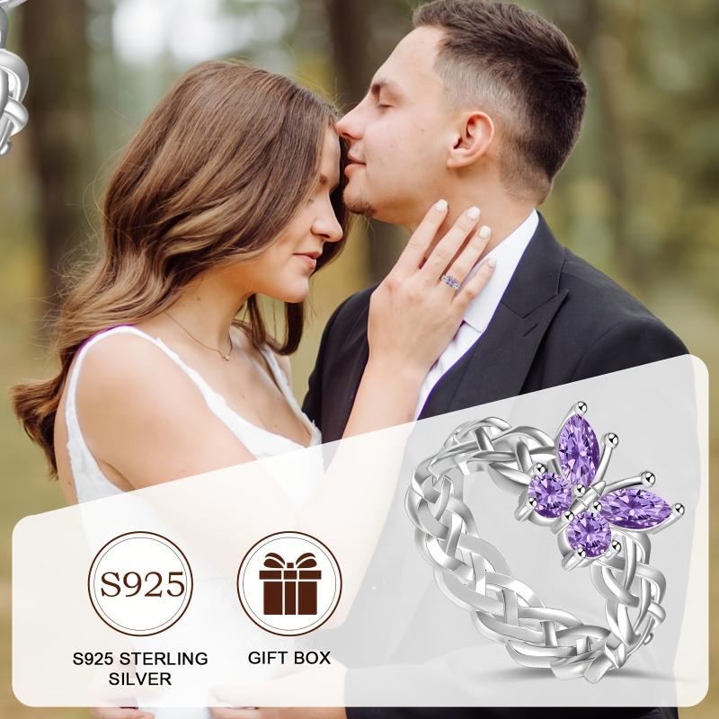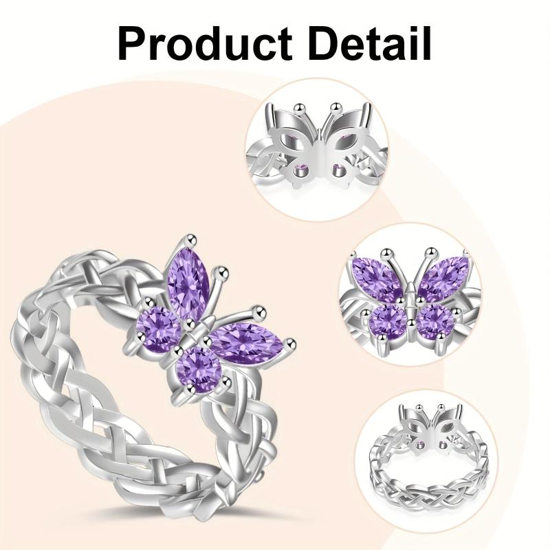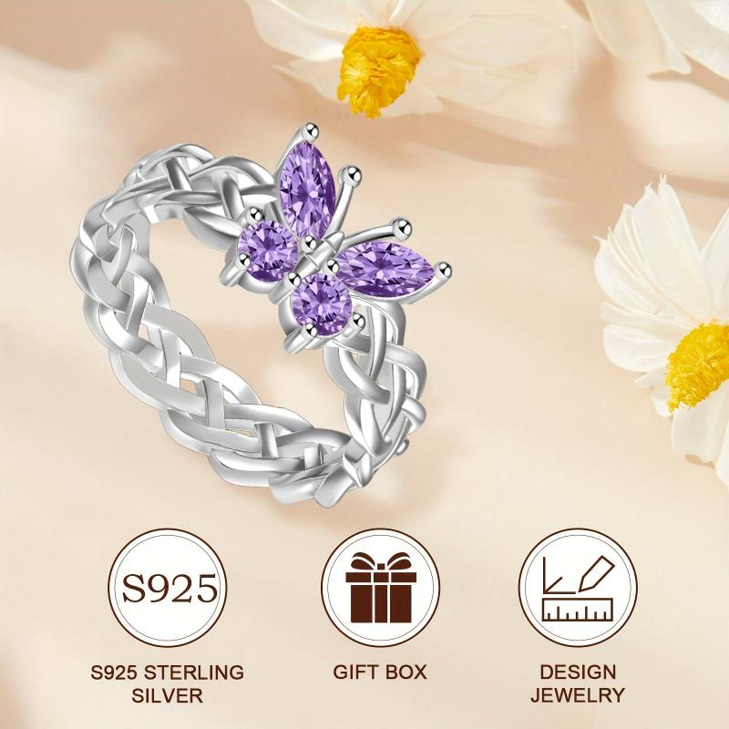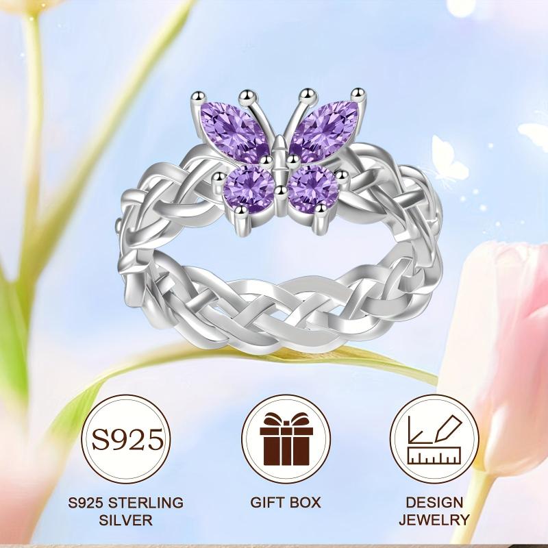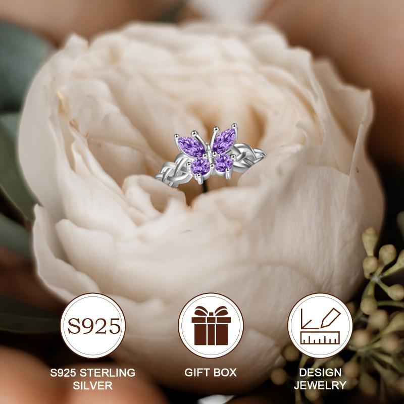 This 925 sterling silver butterfly ring with purple cubic zirconia is perfect for daily wear. It is durable, low allergy, and nickel-free, making it ideal for sensitive skin. A great gift for any occasion.