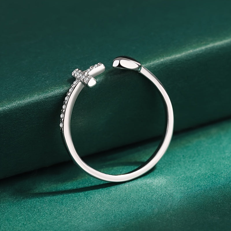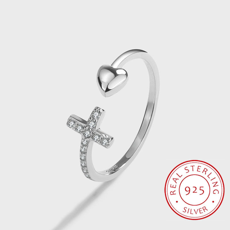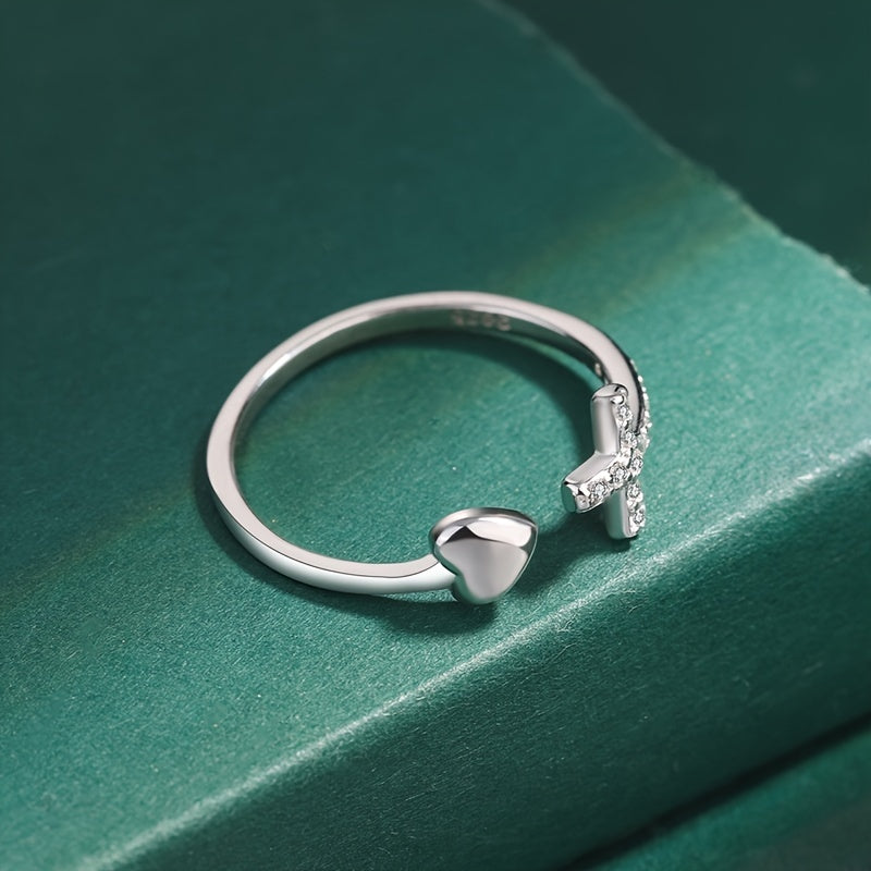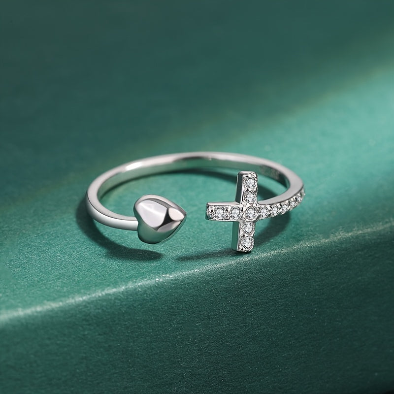 Add a touch of sparkle to your daily outfits with this adjustable cuff ring featuring a cross inlaid with shining zircon and a heart accent. Perfect for any occasion.