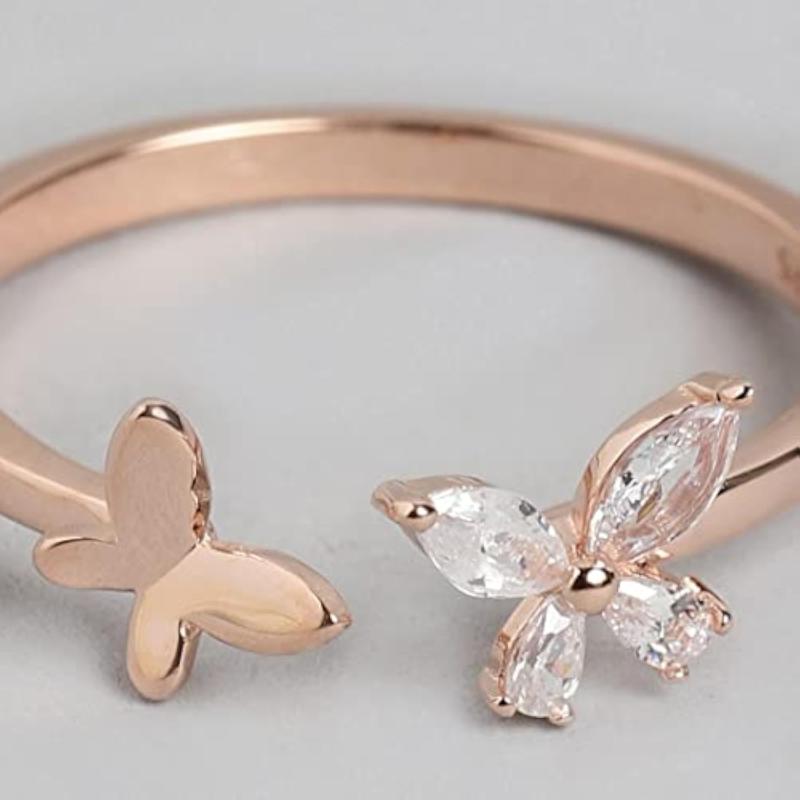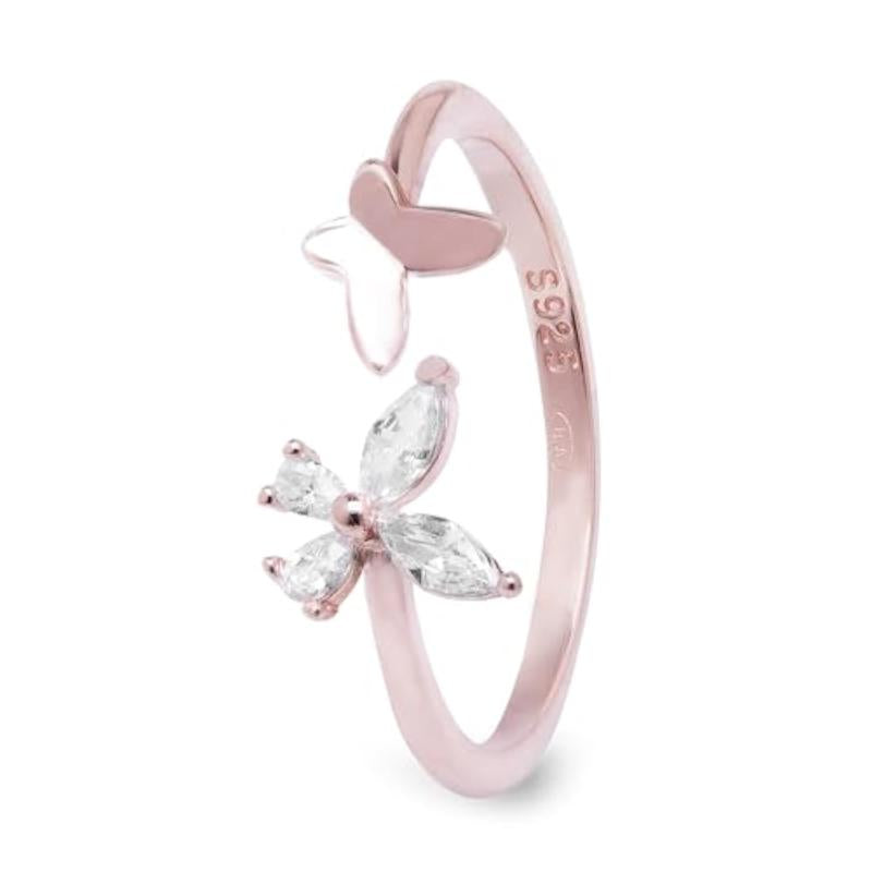This stunning ring features a butterfly design with cubic zirconia stones in a rose plated setting, ideal for everyday wear or special occasions.