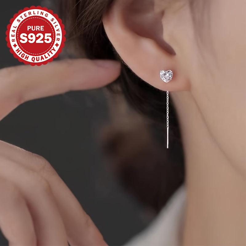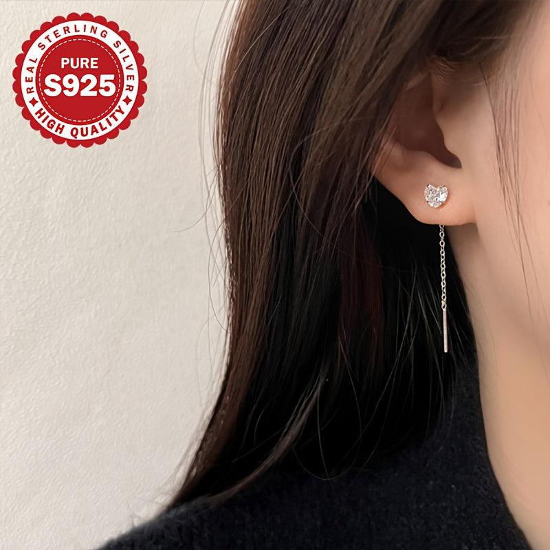 925 Silver CZ Heart Dangle Earrings Hypoallergenic Lightweight Chain Ear Wires