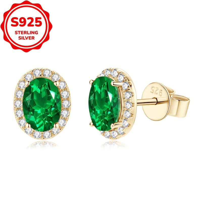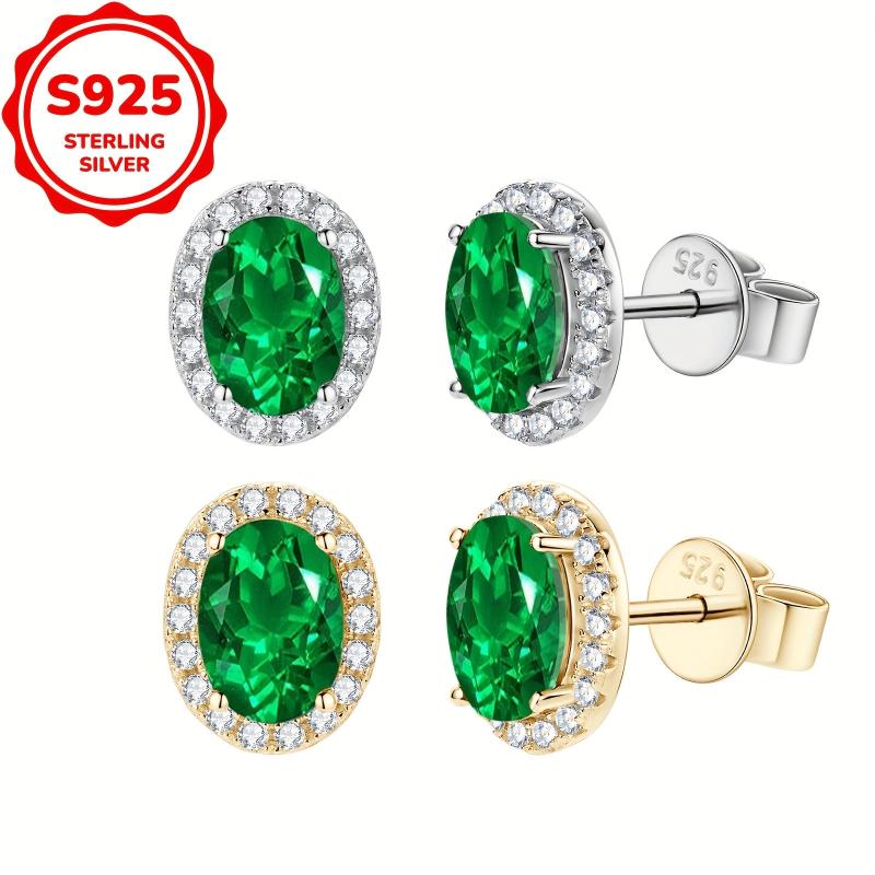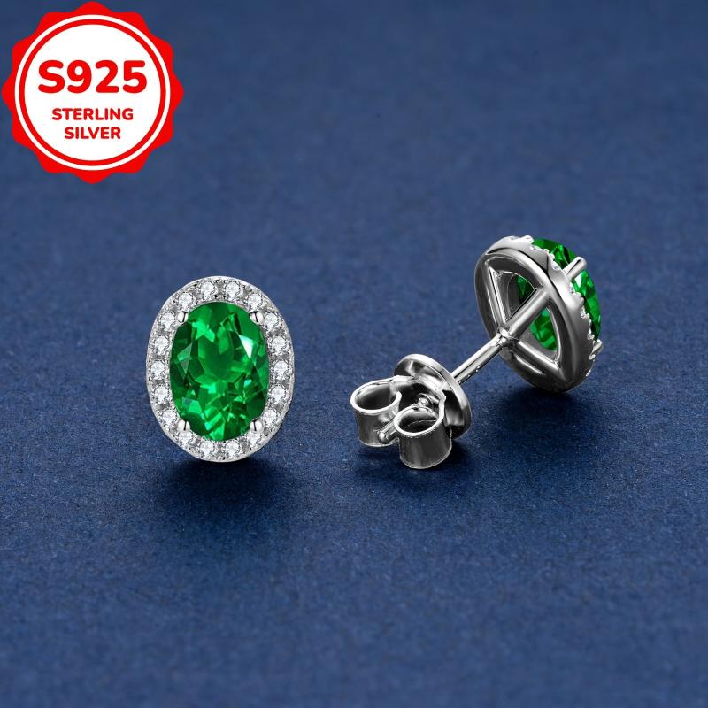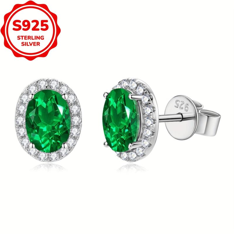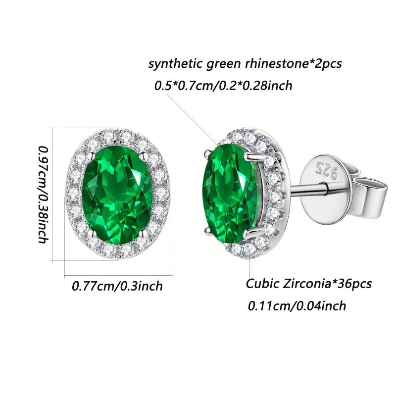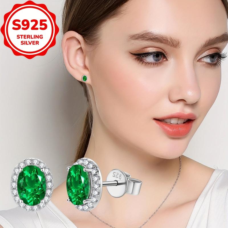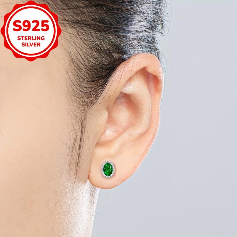 Stunning pair of 925 silver earrings featuring 5x7mm oval synthetic emerald main stones and 36 cubic side stones. Ideal for parties, vacations, or anniversaries.