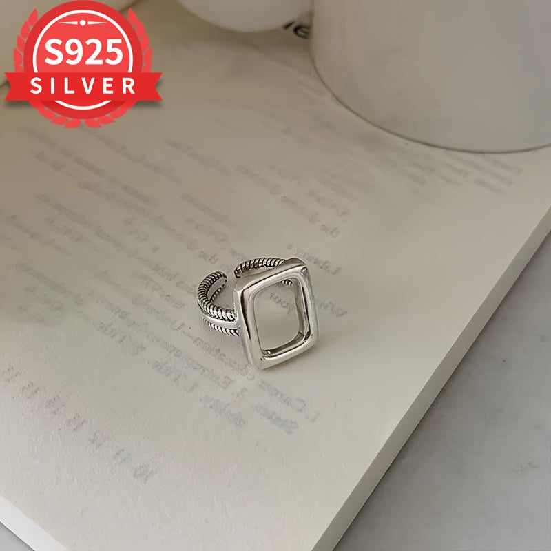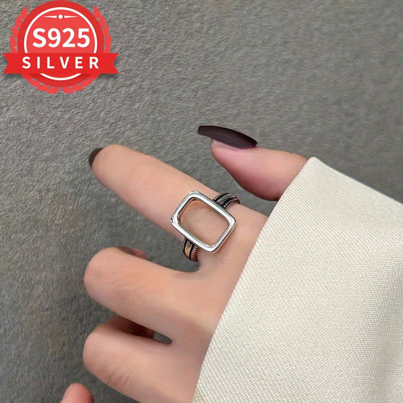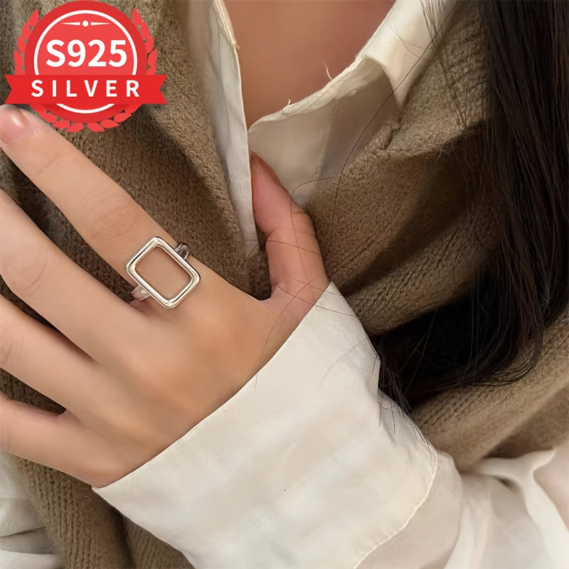 This 925 sterling silver ring features a geometric hollow rectangle design. It is adjustable, hypoallergenic, and perfect for casual attire or gifting. Comes with an anti-tarnish box for storage and protection.