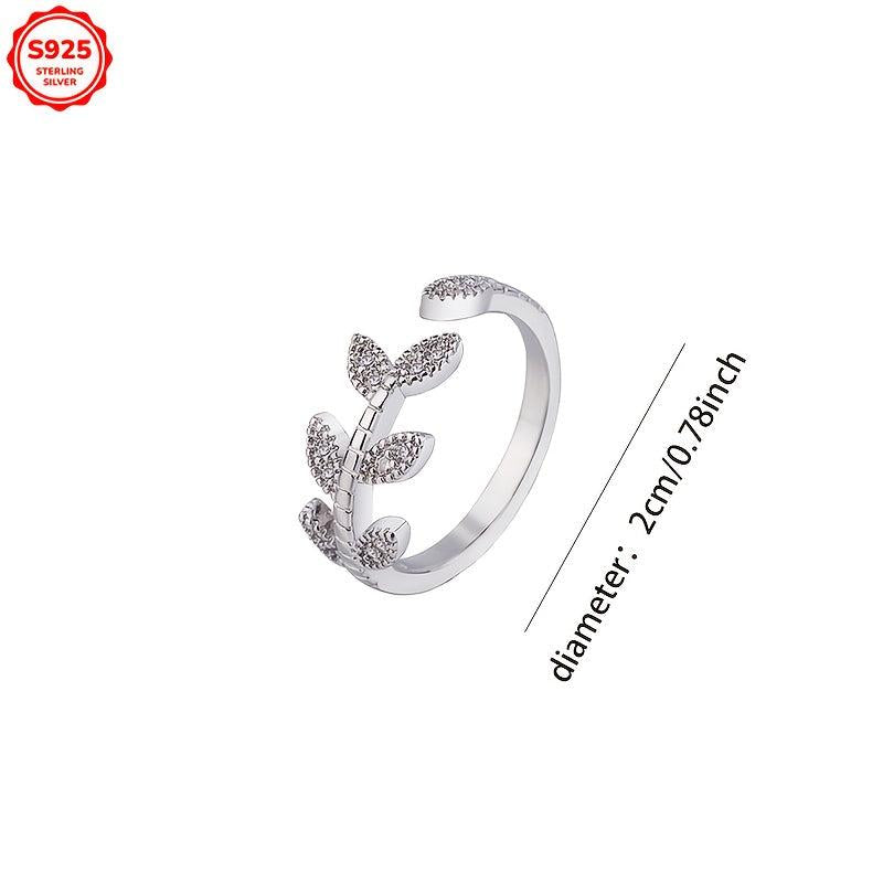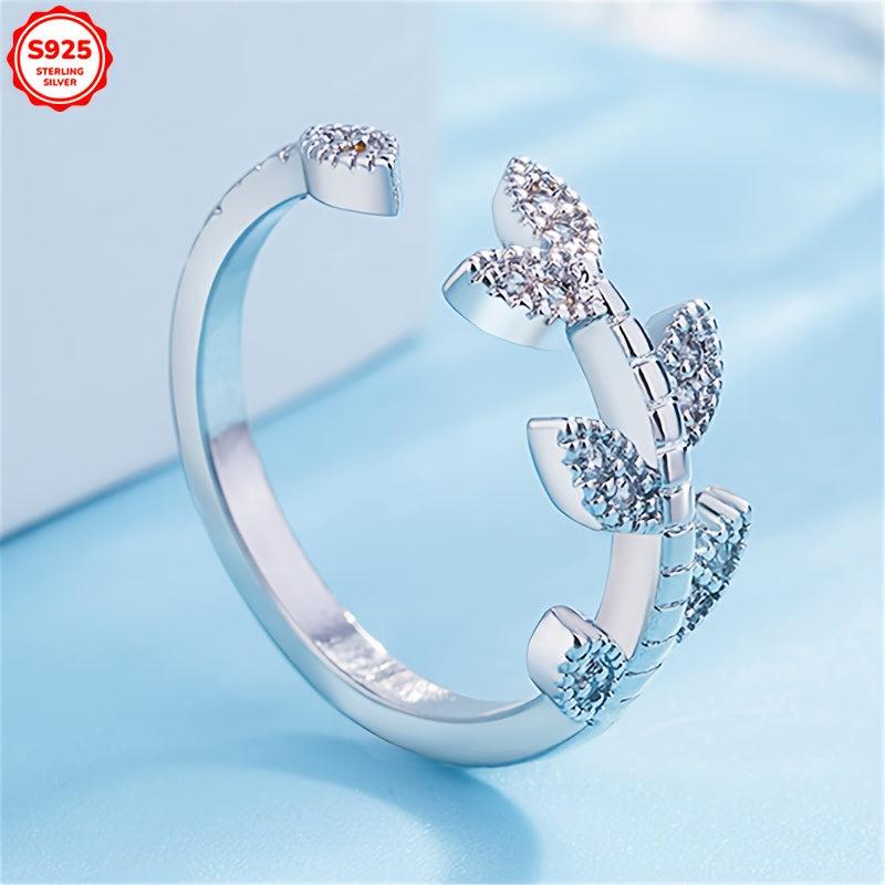 Beautiful 925 Sterling Silver leaf ring with sparkling Cubic Zirconia stones. Features an adjustable open band design. Hypoallergenic, anti-oxidation properties make it perfect for daily wear. Comes in an elegant gift box for a special occasion.