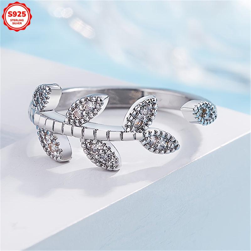 925 Silver Leaf Ring w/ Cubic Zirconia Adjustable Band Gift Box Ideal for Women