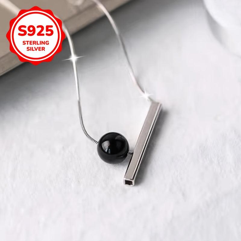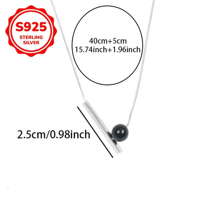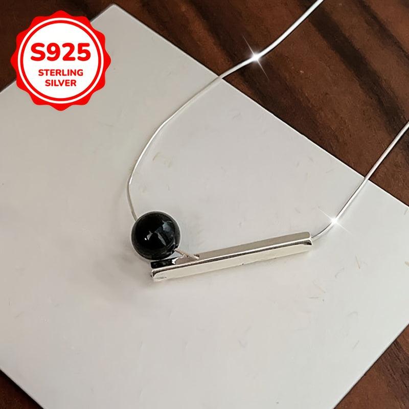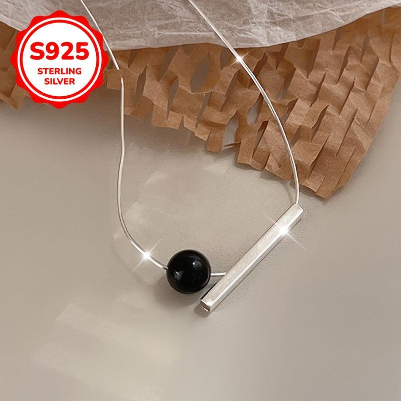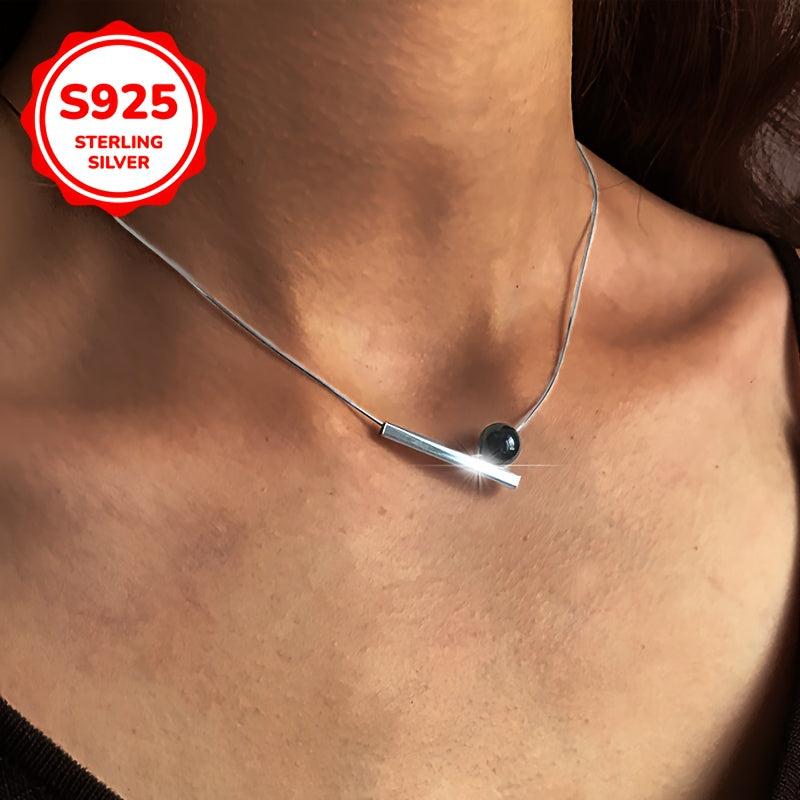 Elegant and stylish 925 silver necklace featuring a combination of geometric agate round bead and square tube design. Perfect for women with low allergy sensitivity, adding a touch of high-end fashion to any outfit.