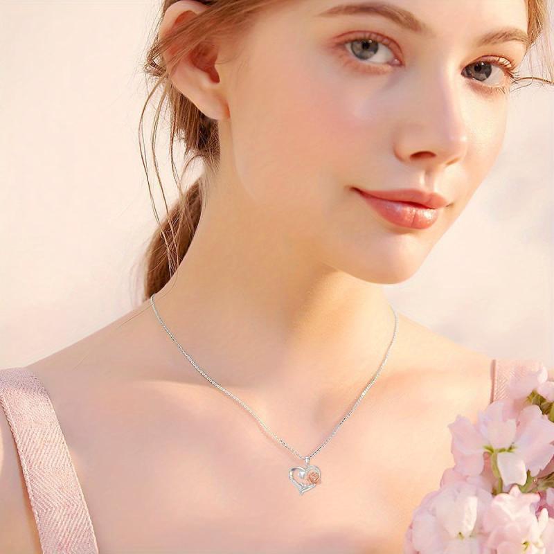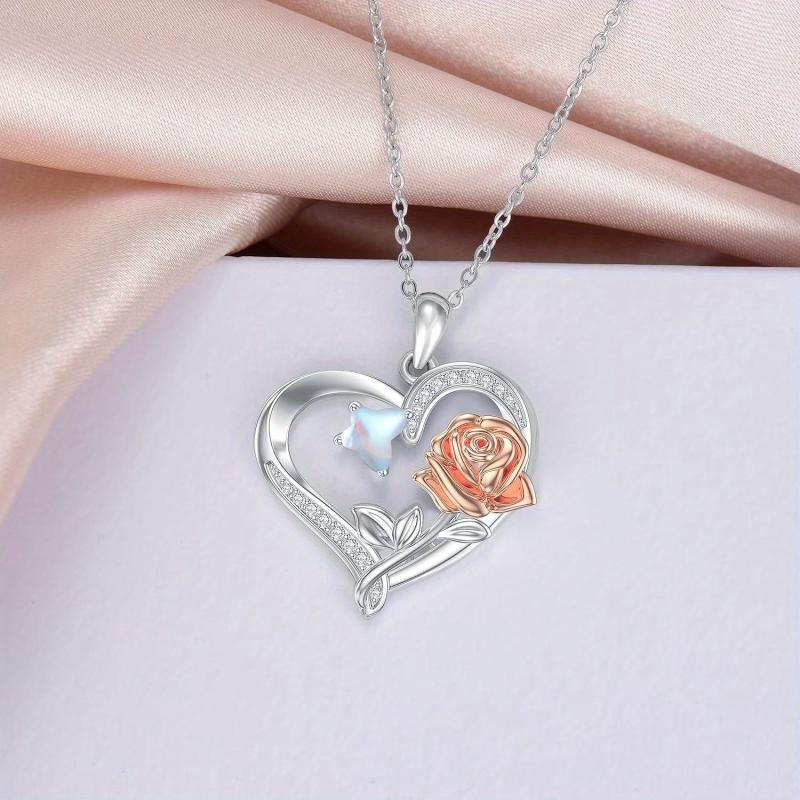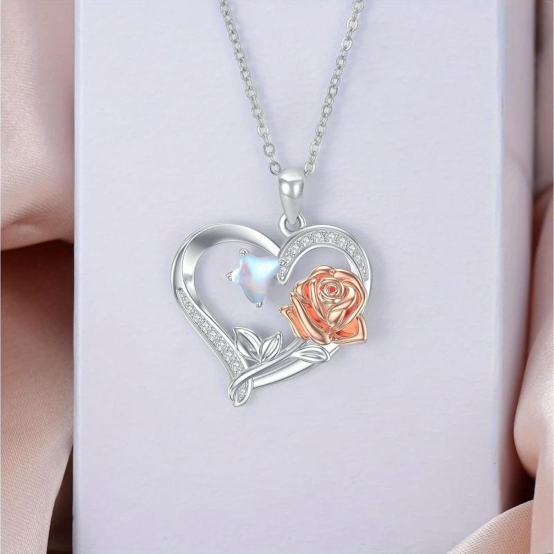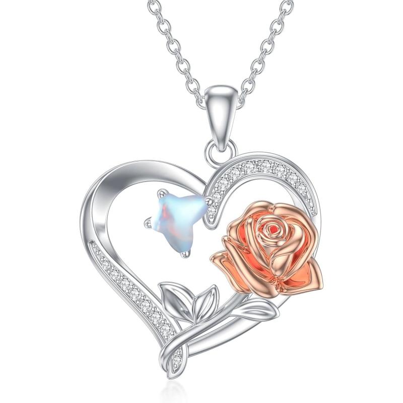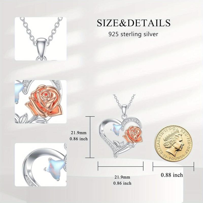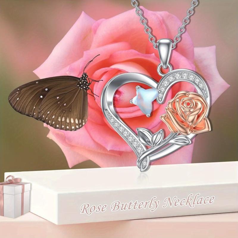 Elegant and charming pendant necklace featuring a rose flower moonstone butterfly and heart design. Perfect gift for wife, girlfriend, mom, or daughter on their anniversary or birthday.