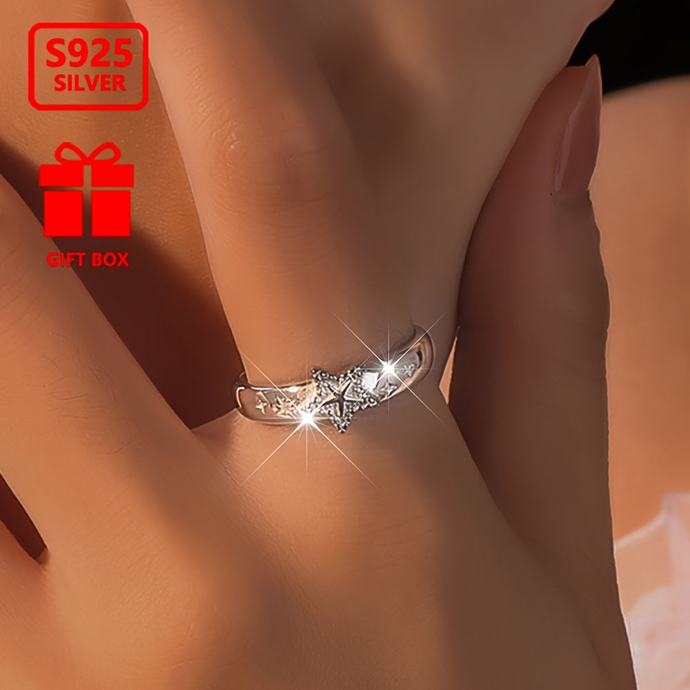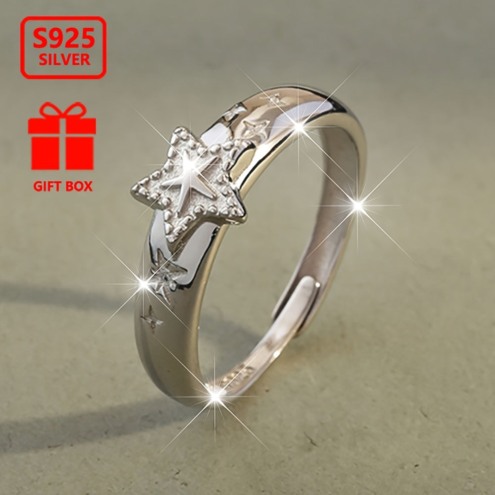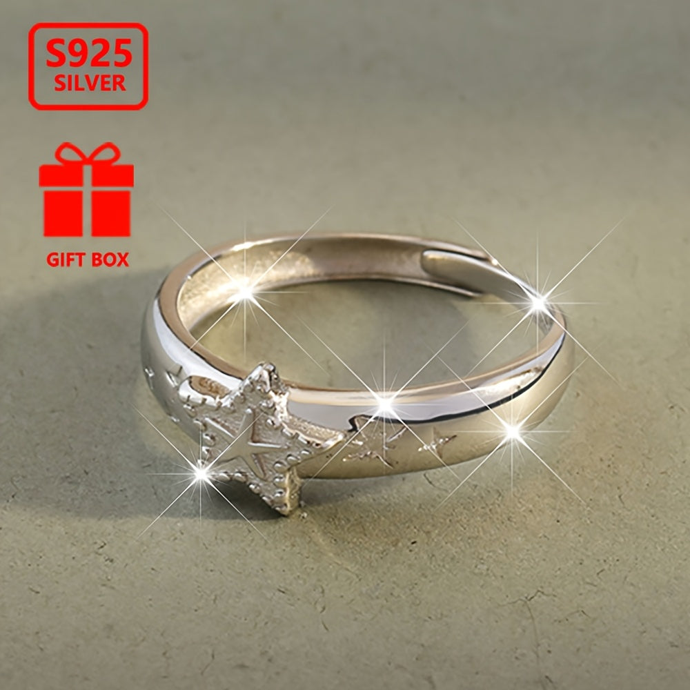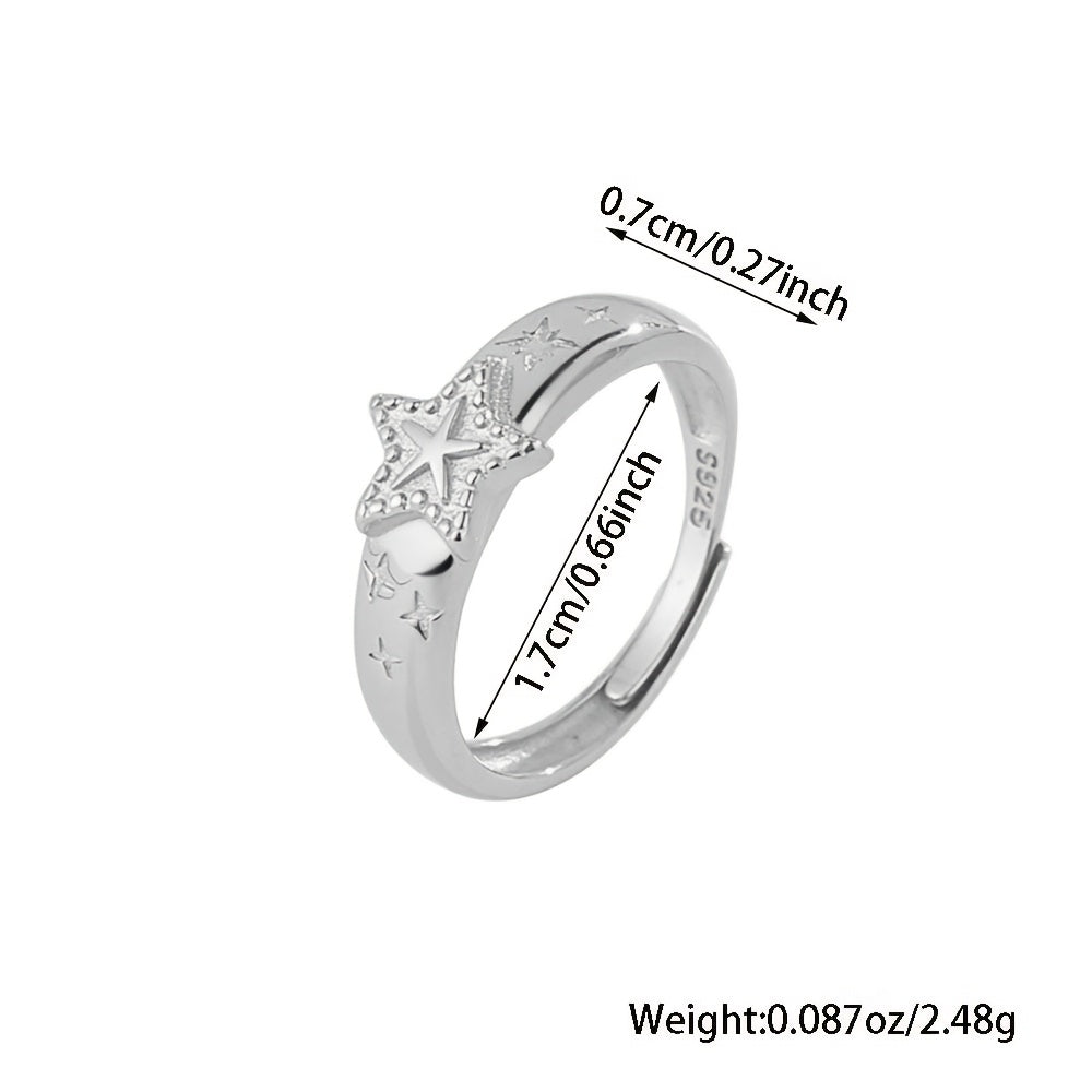 This 925 silver open ring features a stunning five-pointed star design. It is adjustable and suitable for daily wear or special occasions.