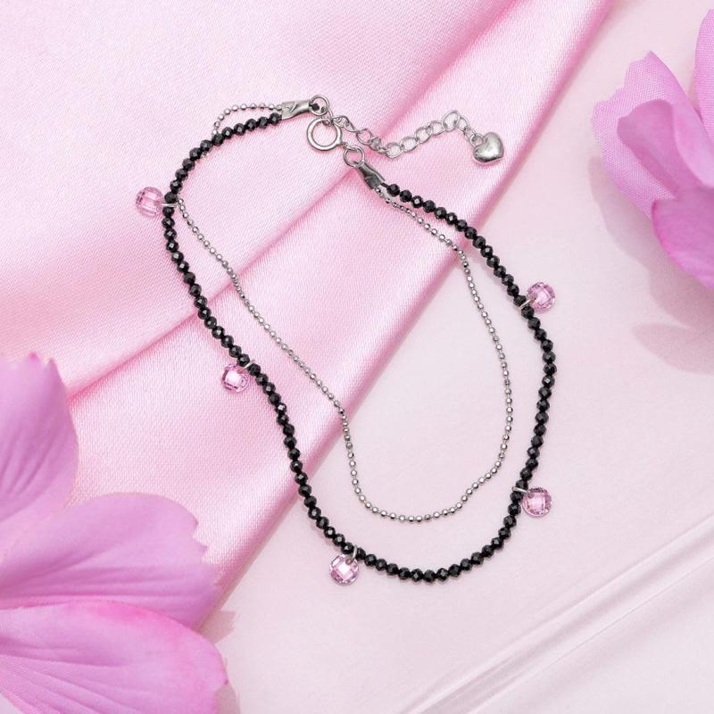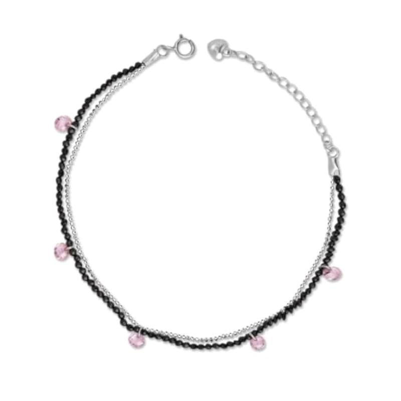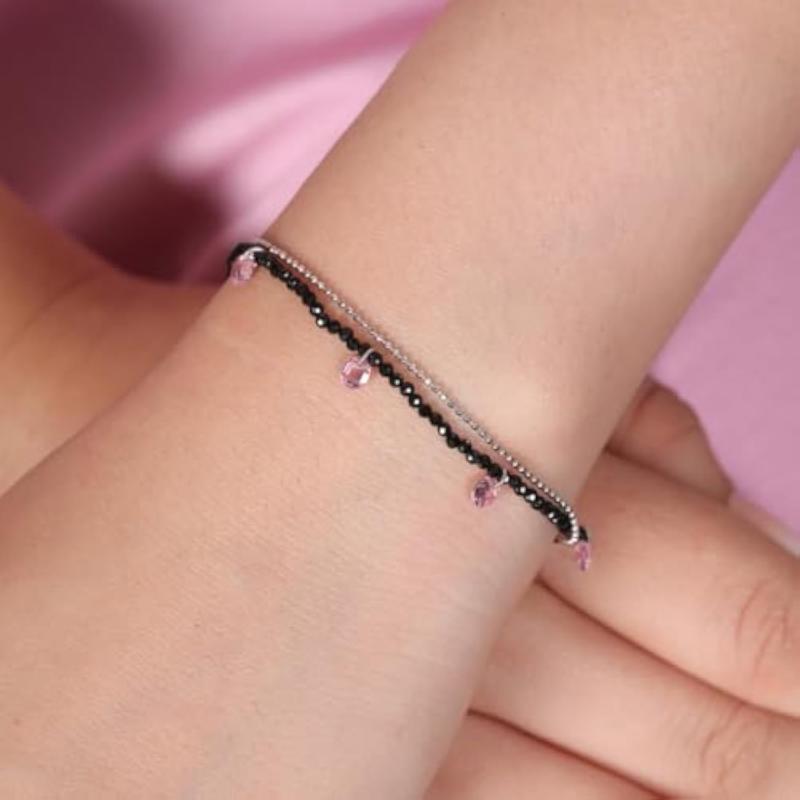 Elegant and stylish 925 sterling silver bracelet with pink stones and beads. Rhodium plated for lasting shine.