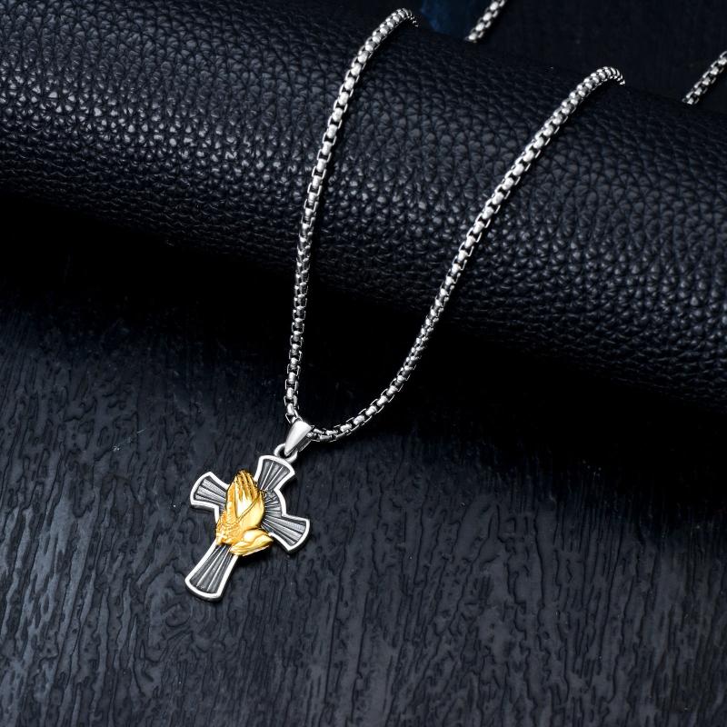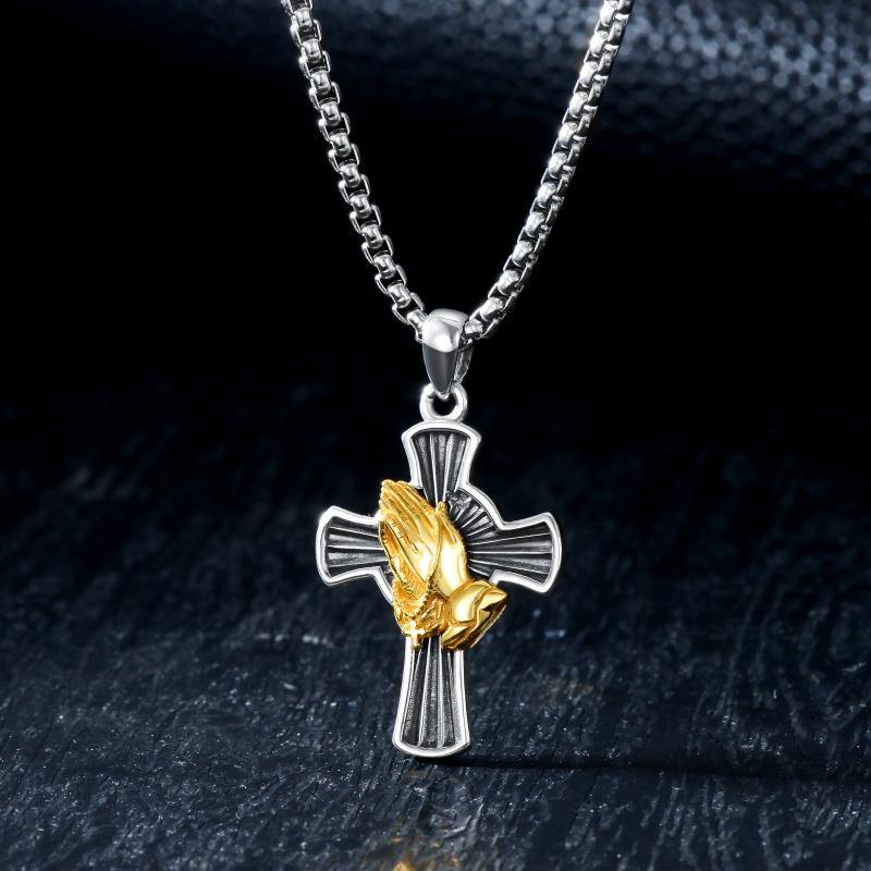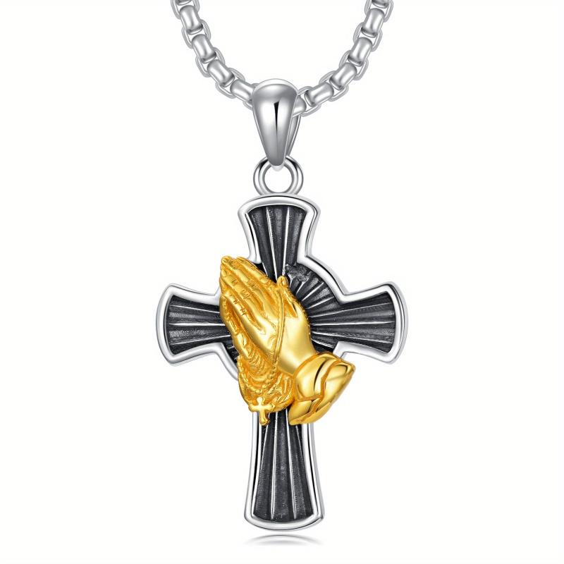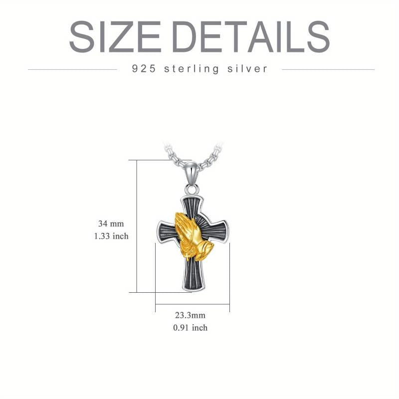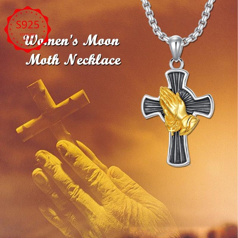 This elegant necklace features a prayer hand design with a cross pendant in 925 sterling silver.