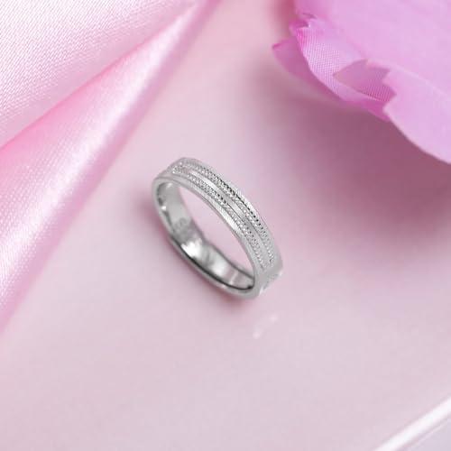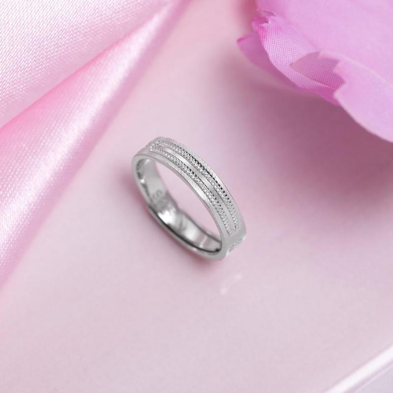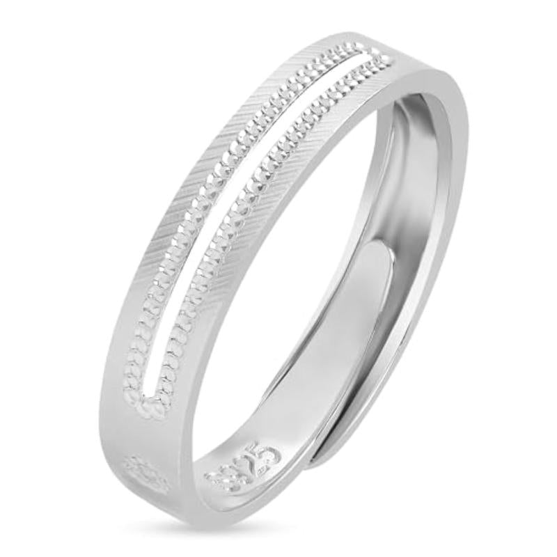 This minimalist ring is made of 925 sterling silver with a textured design and rhodium plating. It features a hallmark for authenticity.