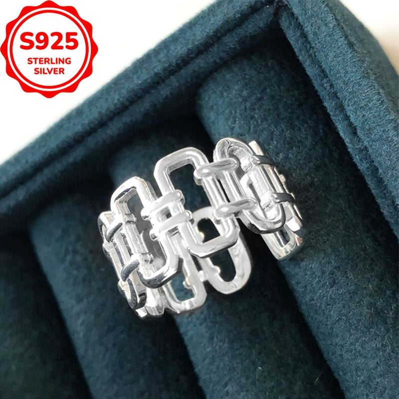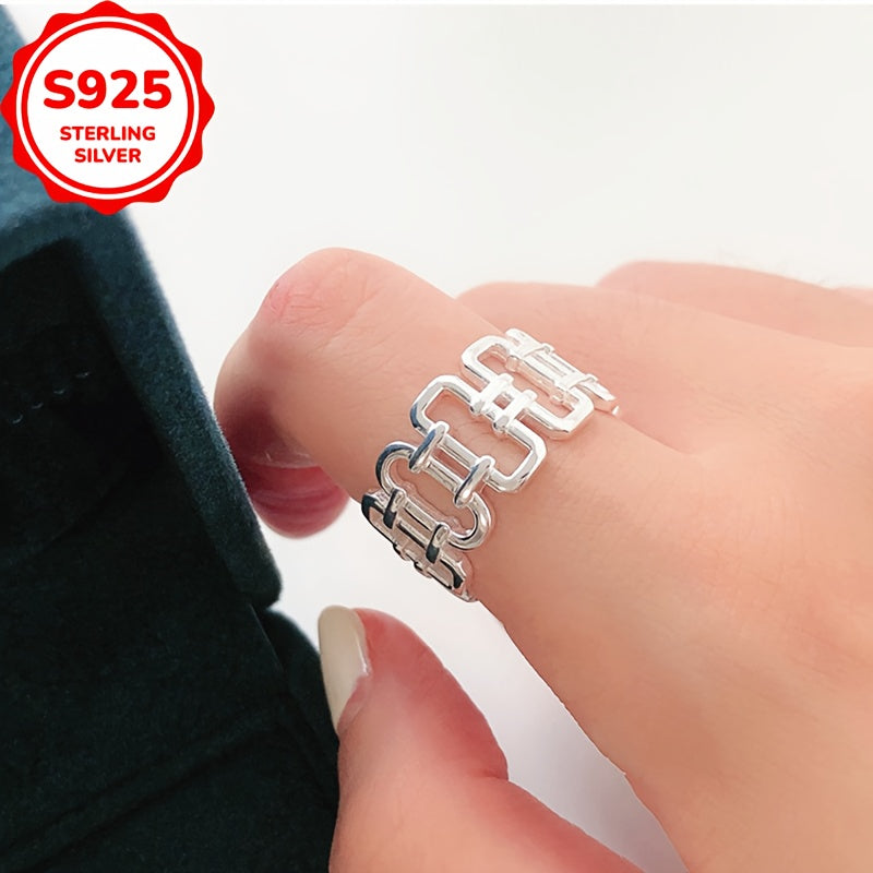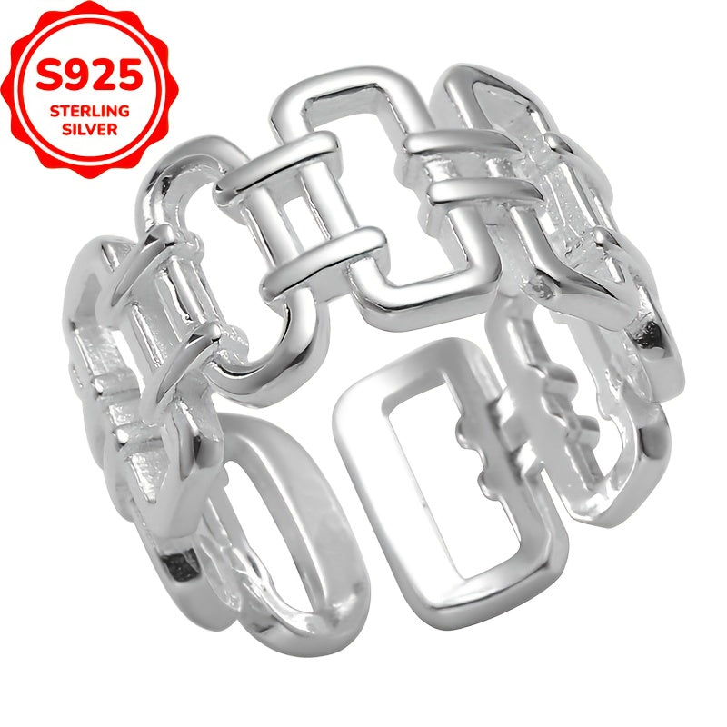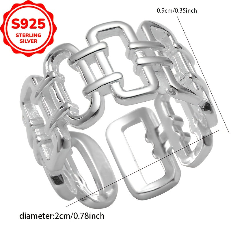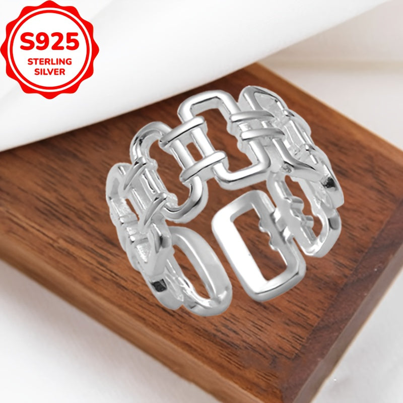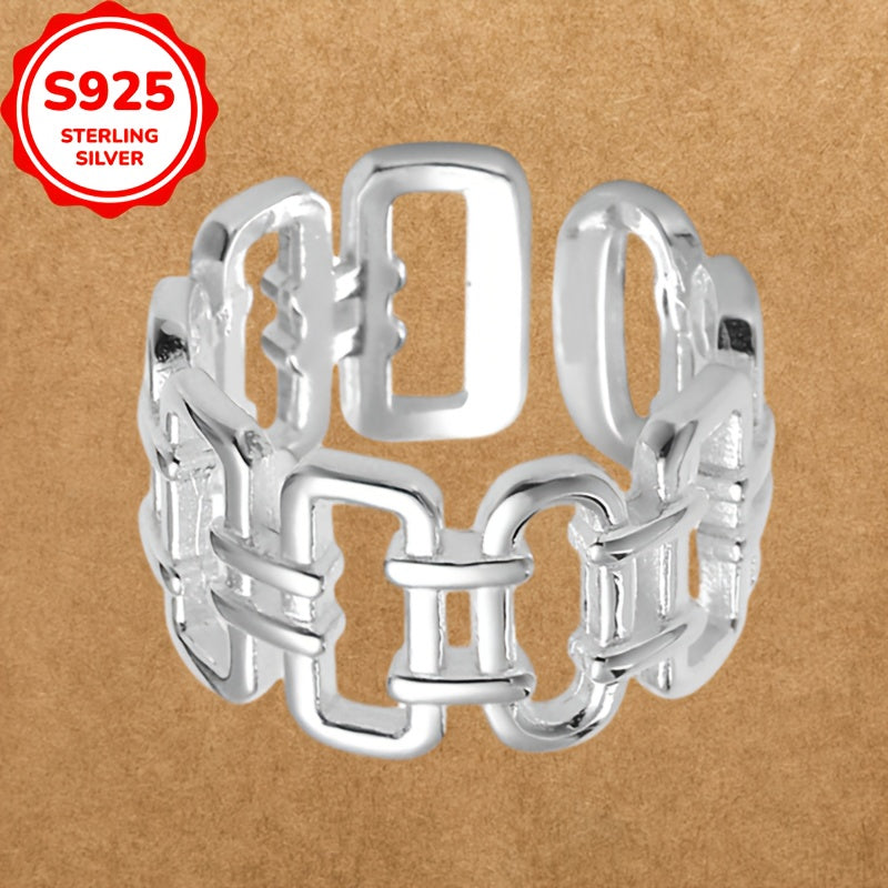 Add a touch of elegance to your outfit with this minimalist adjustable ring. Crafted from hypoallergenic 925 sterling silver and plated with 18K gold, this wide band ring features a geometric chain link design. Perfect for daily wear.