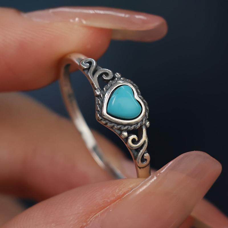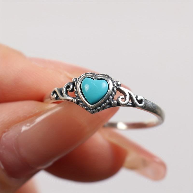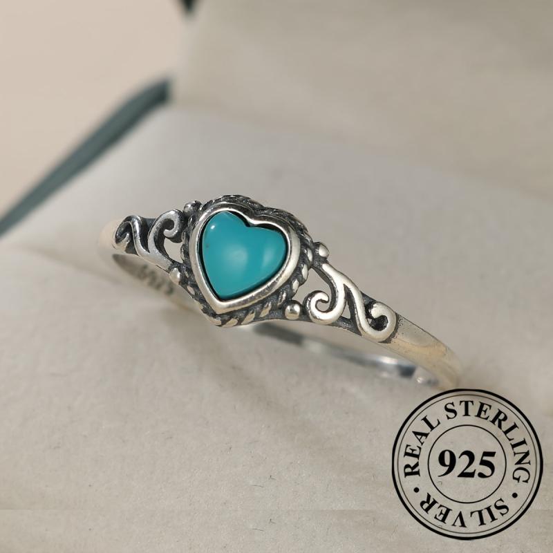 This 925 sterling silver ring features a retro design with a flower and heart motif inlaid with turquoise, symbolizing history and beauty. It makes a thoughtful gift for your loved one.