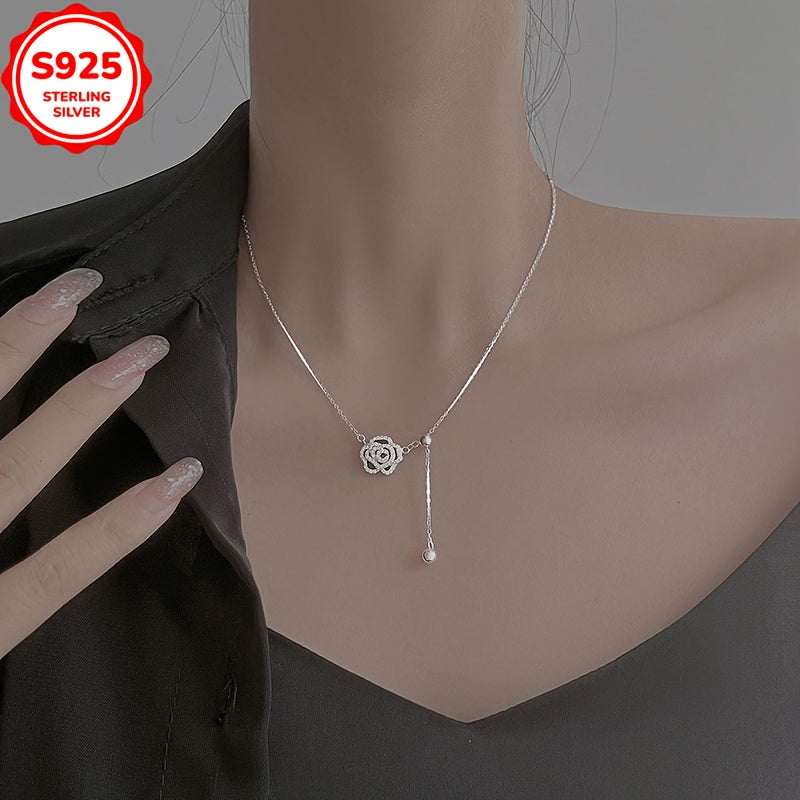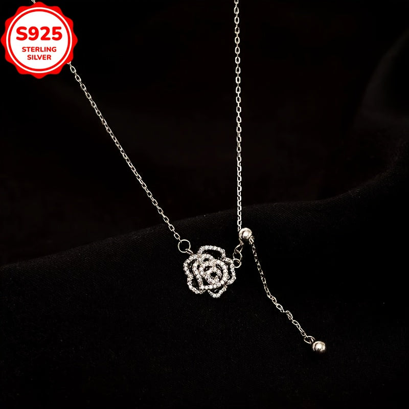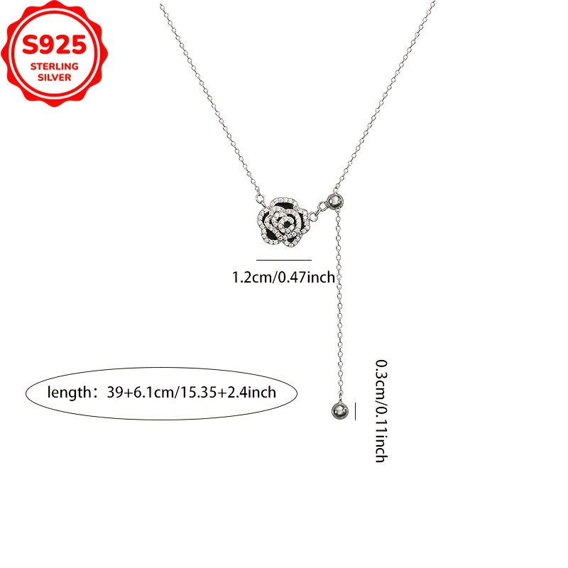 This stunning pendant necklace is made of 925 sterling silver and features a rose design with sparkling rhinestones. Perfect for all occasions, this seasonless jewelry piece is a great gift idea.