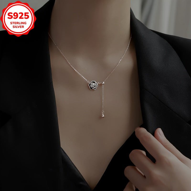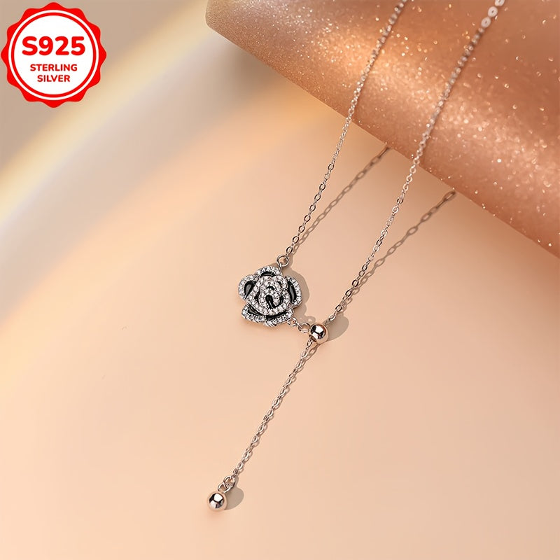 925 Silver Rose Pendant Necklace with Rhinestones, Hypoallergenic & Durable