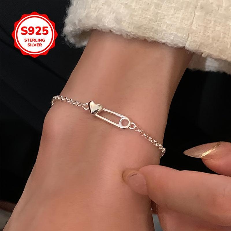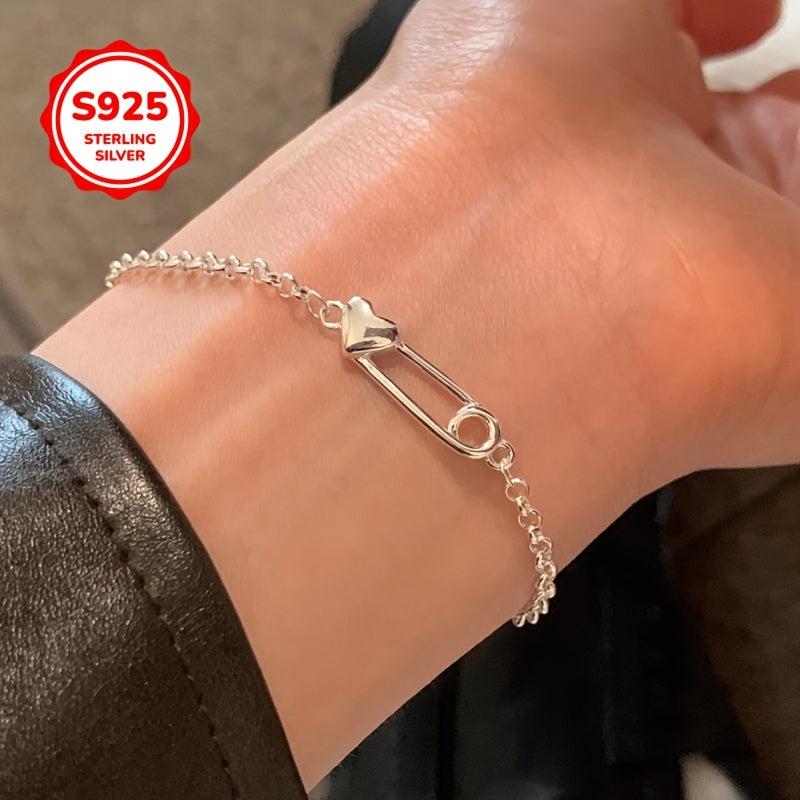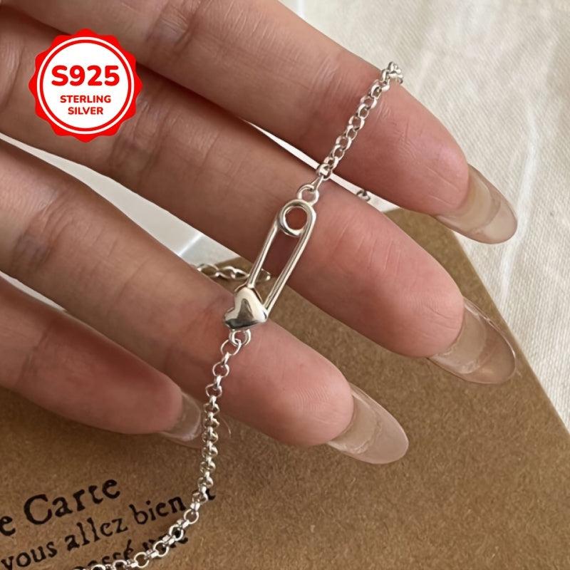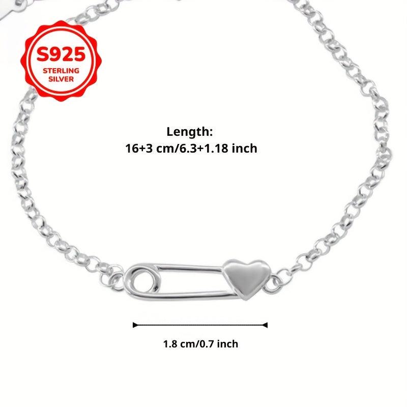 This 925 sterling silver bracelet features a sweetheart and safety pin design. Hypoallergenic, minimalist, and perfect for gifting. Comes in an anti-oxidation storage box.