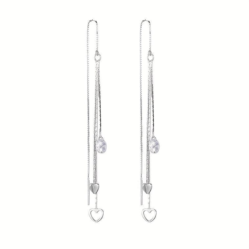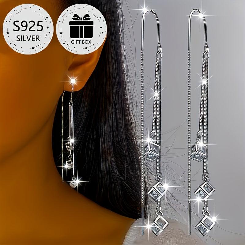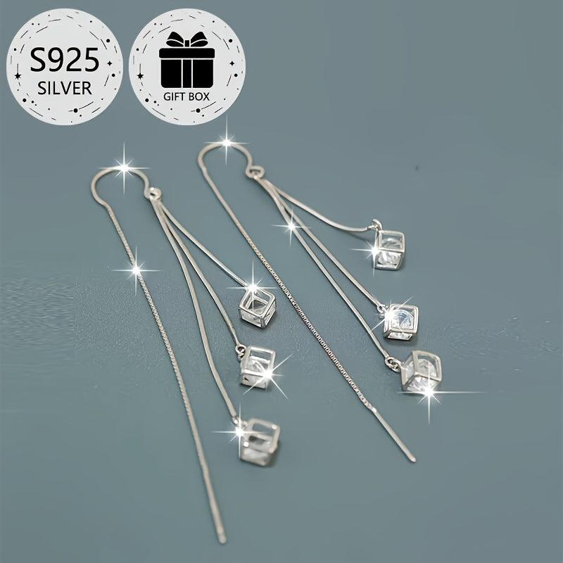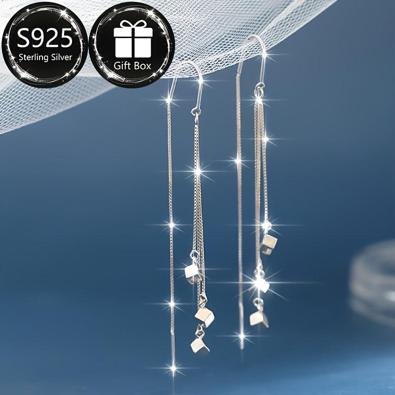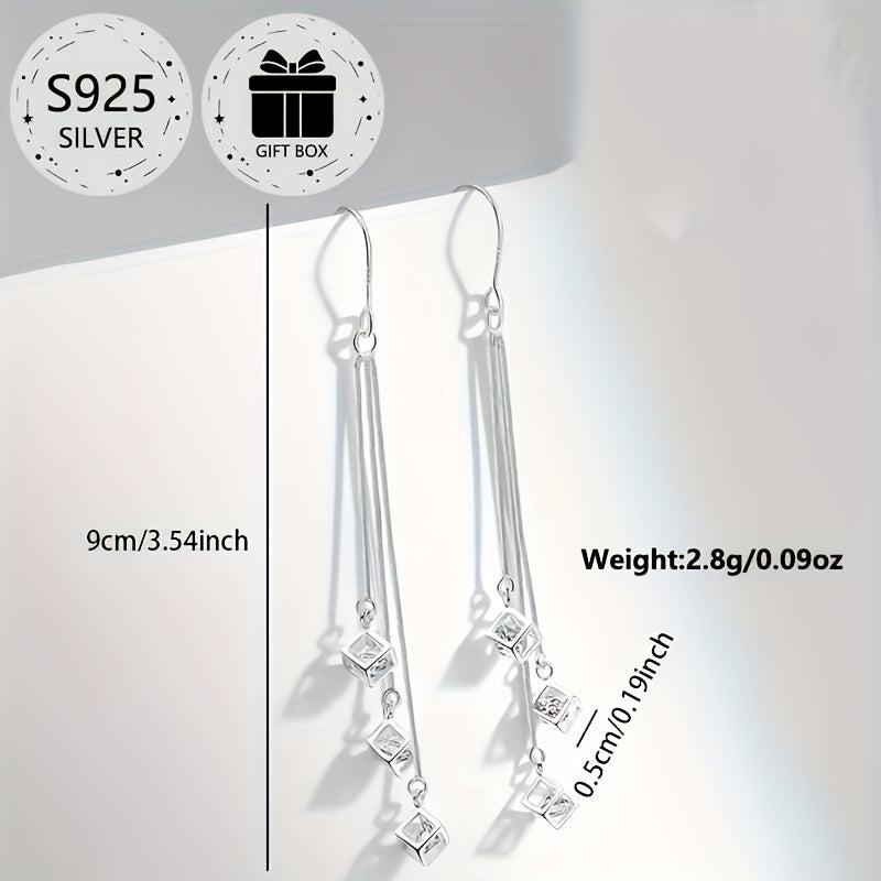 These elegant dangle earrings feature a versatile design with three cube-shaped tassels. Made with 925 silver, lightweight and stylish. Total weight approximately 2.8g. Includes heart-shaped perfect gift box.