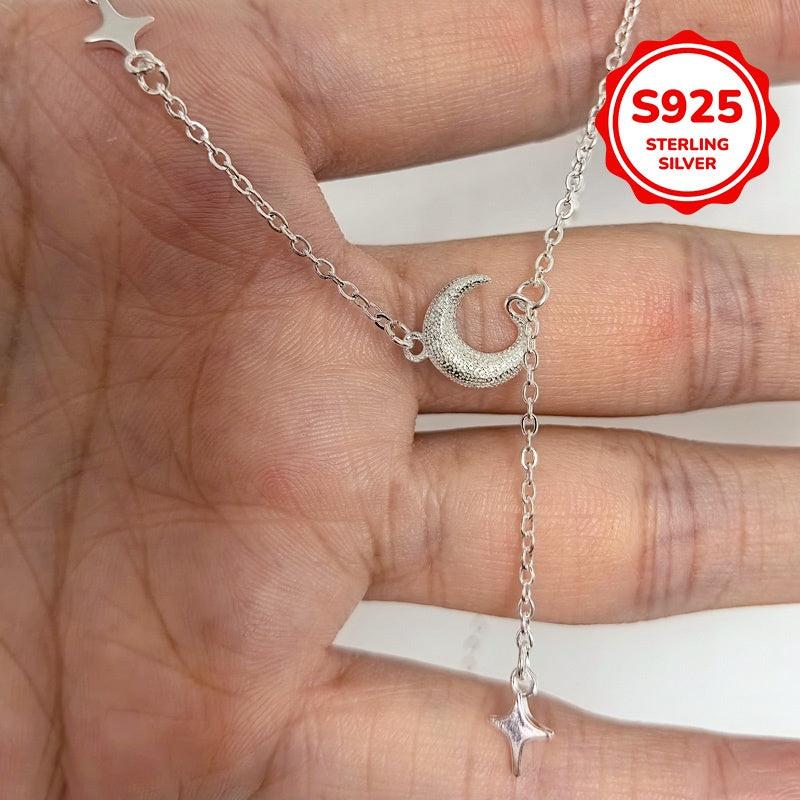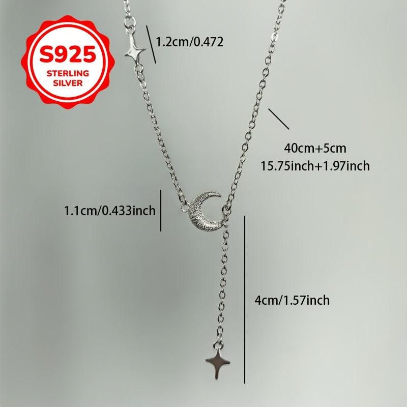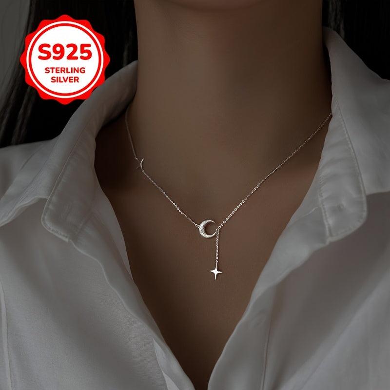 Elegant moon and star pendant necklace with tassel on a collarbone chain. Hypoallergenic and stylish, suitable for all occasions.