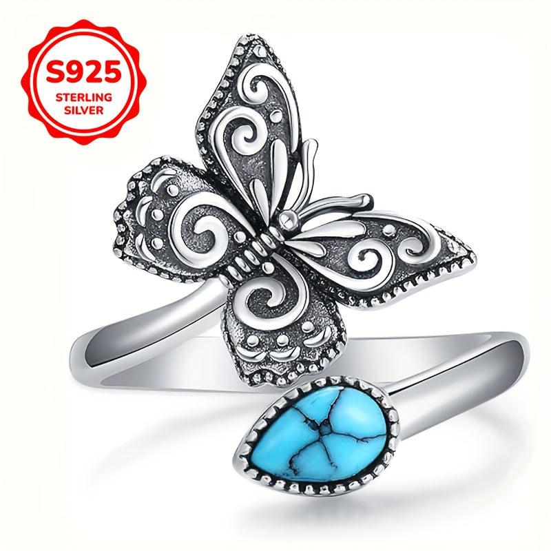 This beautiful vintage-style ring features a carved butterfly design with faux turquoise and an open adjustable spoon band. Made of 925 sterling silver, hypoallergenic and perfect for men and women.