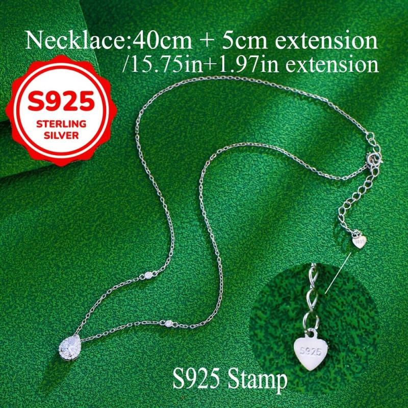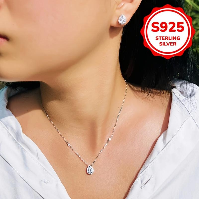Elegant set featuring a water drop shape pendant with synthetic zirconia on a hypoallergenic chain. Includes matching stud earrings. Ideal for a classic and minimalist look.