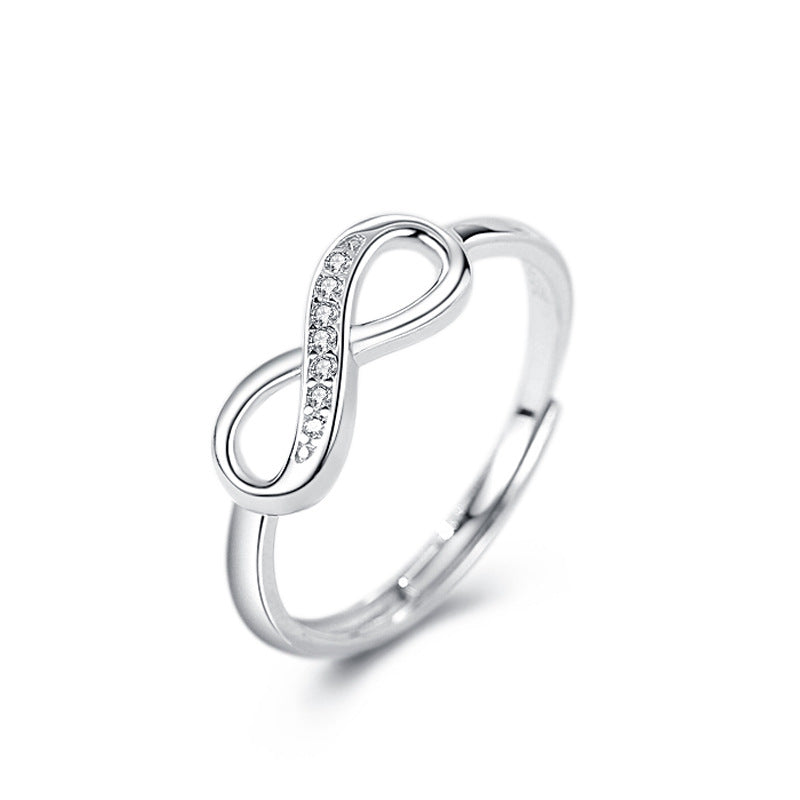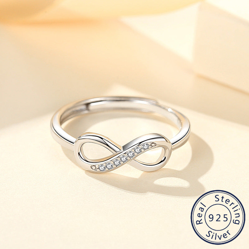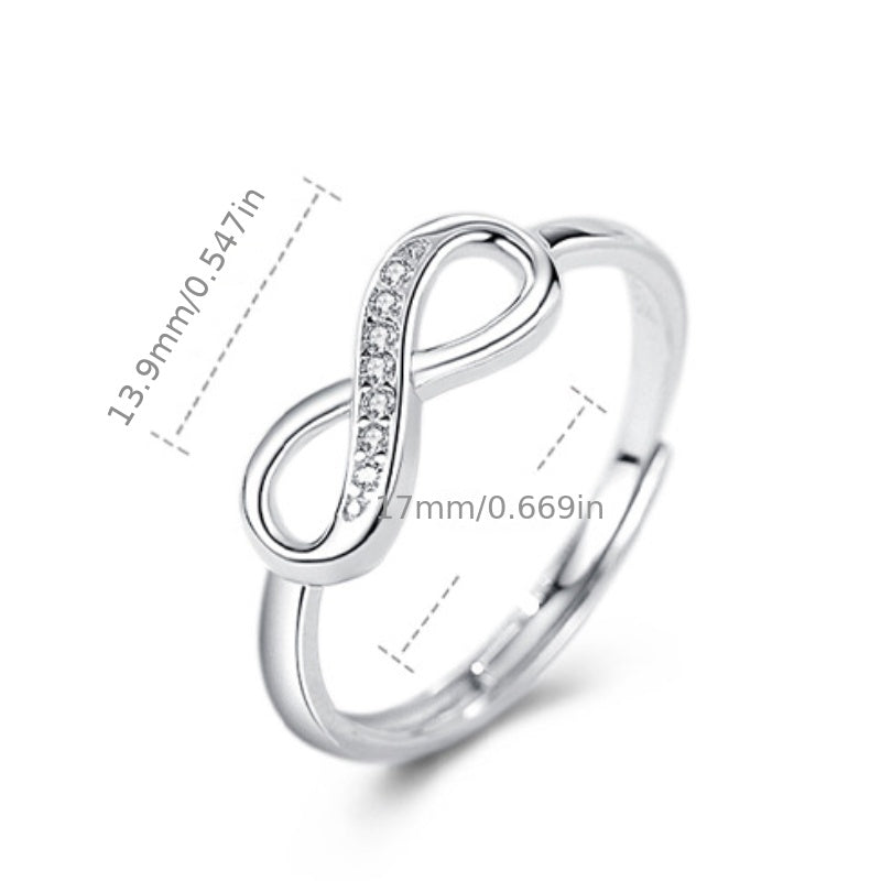 Stunning 925 sterling silver ring featuring an infinity sign inlaid with shimmering zircon stones. Adjustable design for daily wear, perfect for a high birthday gift. Show her she deserves it!