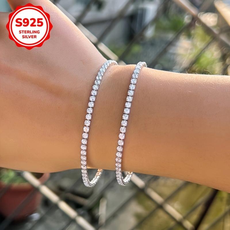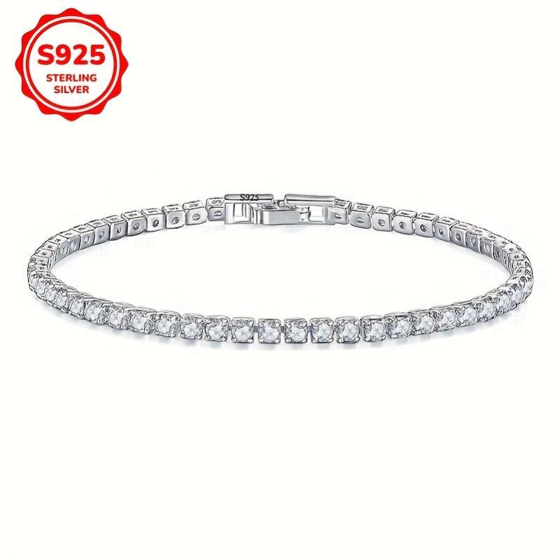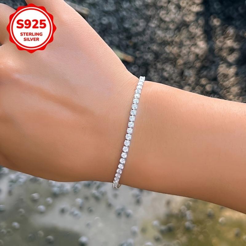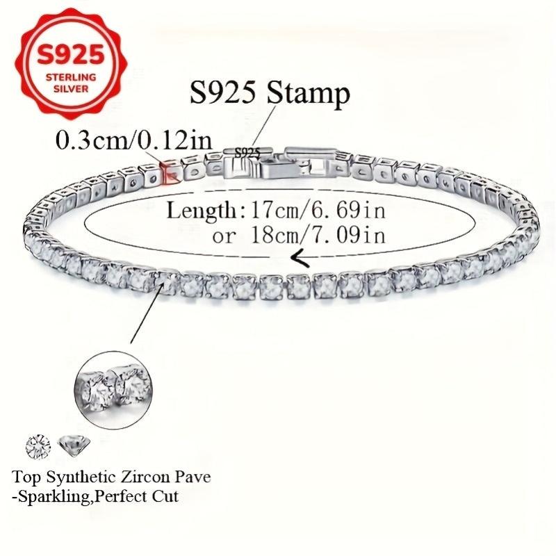 This classic tennis bracelet features a row of broken round synthetic zirconia stones, set in hypoallergenic 925 sterling silver. It weighs between 6.34-6.44g and is 3mm in width, making it a timeless and elegant accessory.