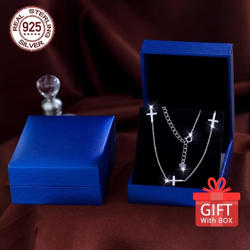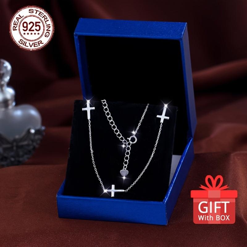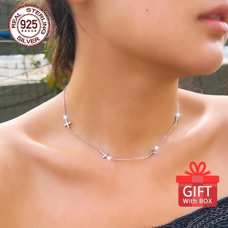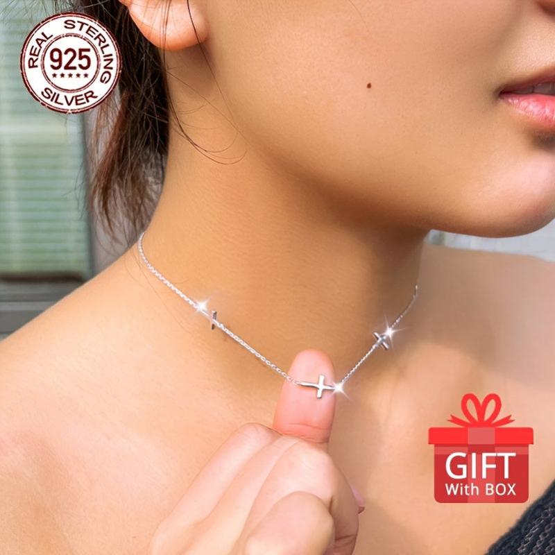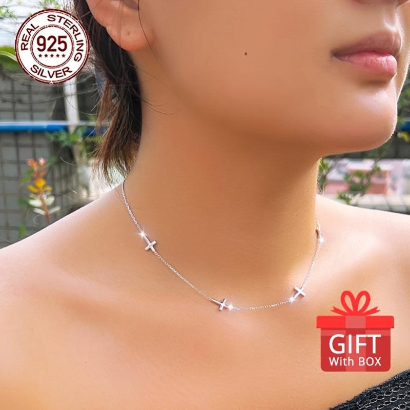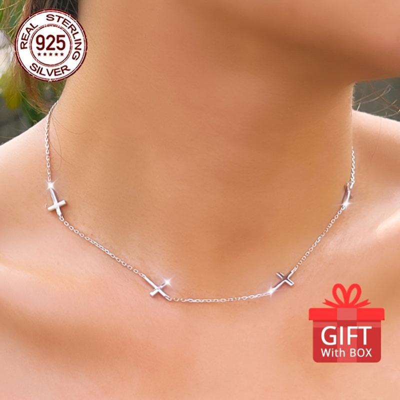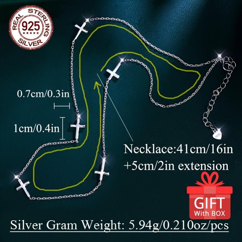 This classic horizontal cross necklace is made of hypoallergenic 925 sterling silver. It weighs 5.94g and features a connected pendant chain. Perfect for everyday wear and adds a touch of elegance to your collarbone.