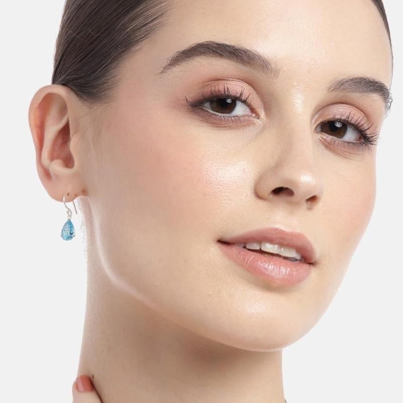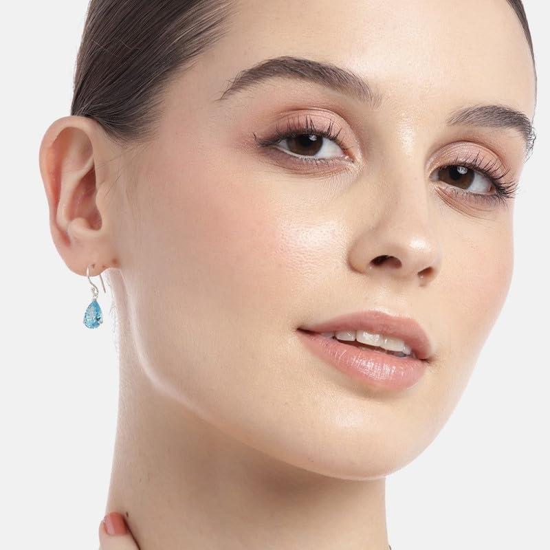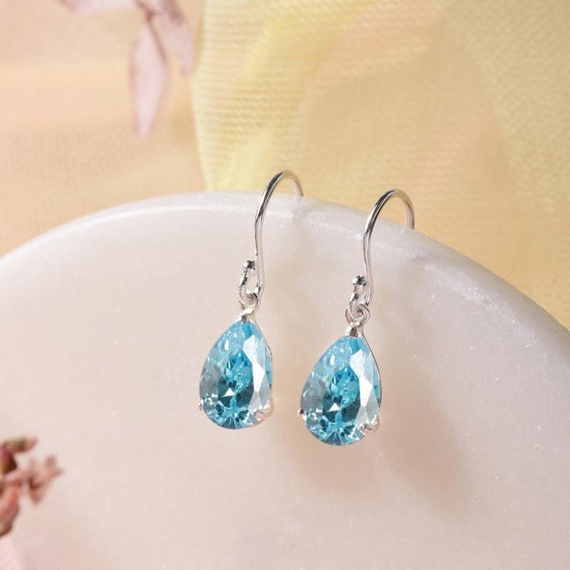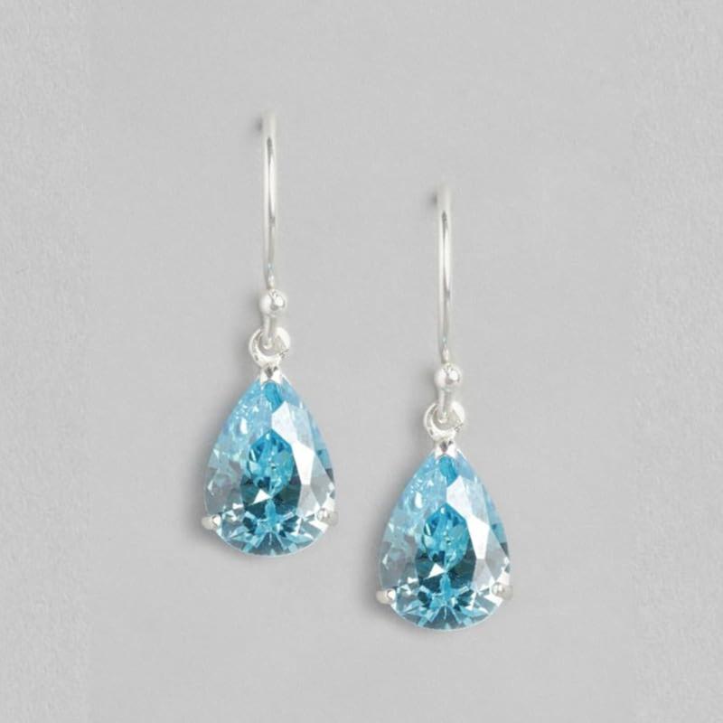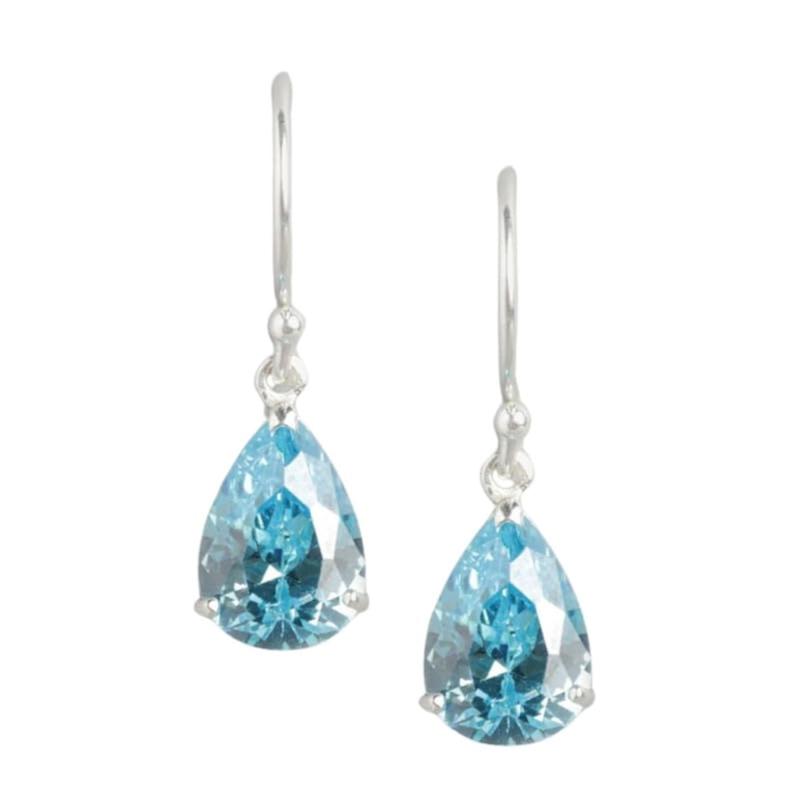 These elegant rhodium plated earrings feature tear drop sapphires, perfect for girls.