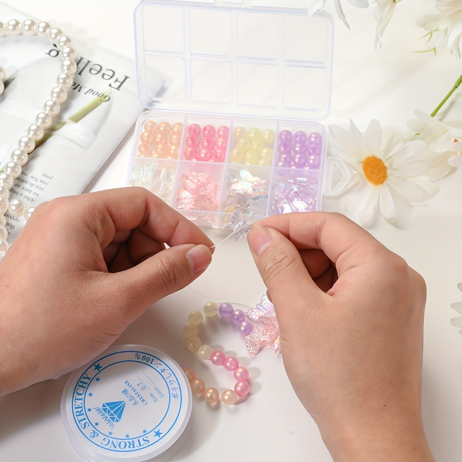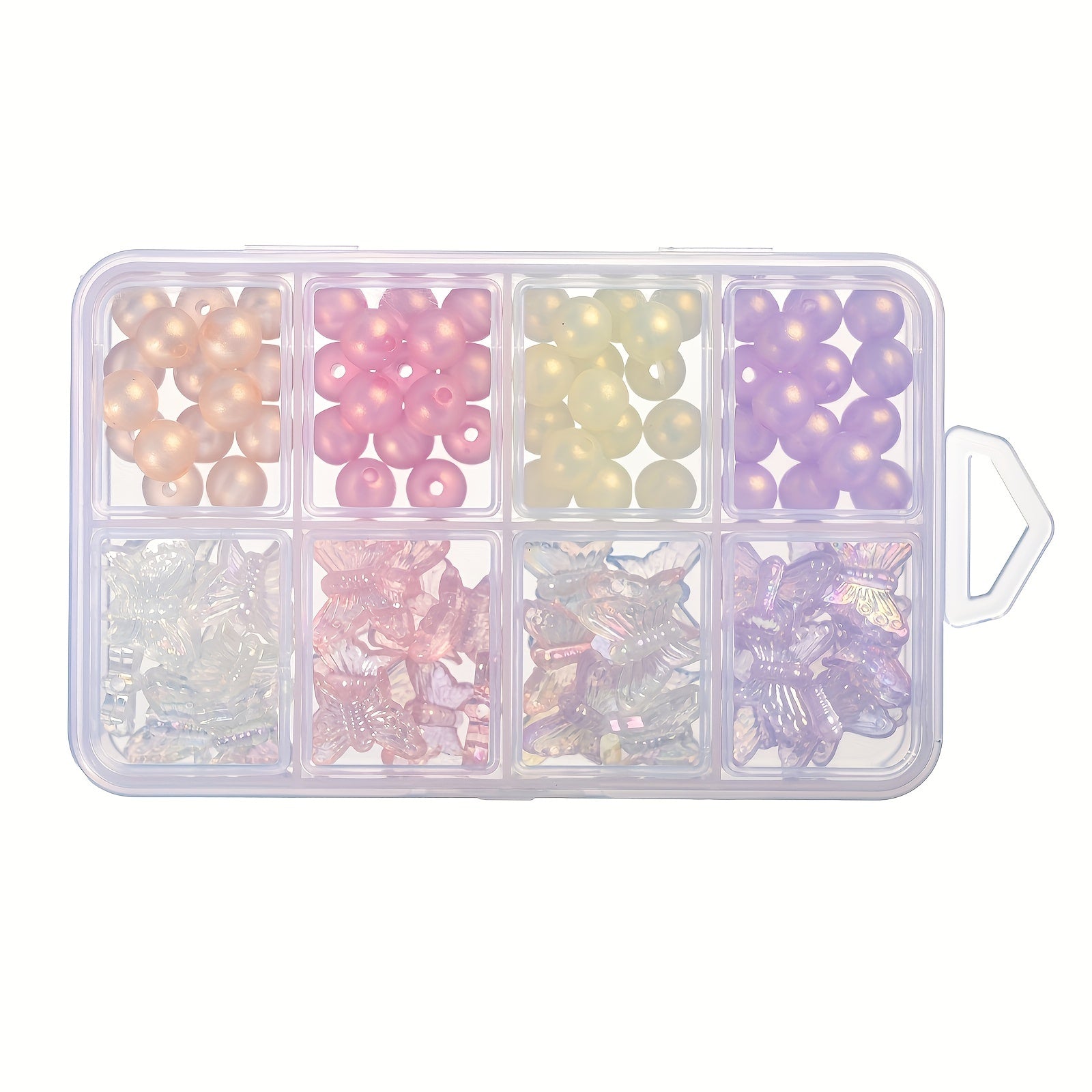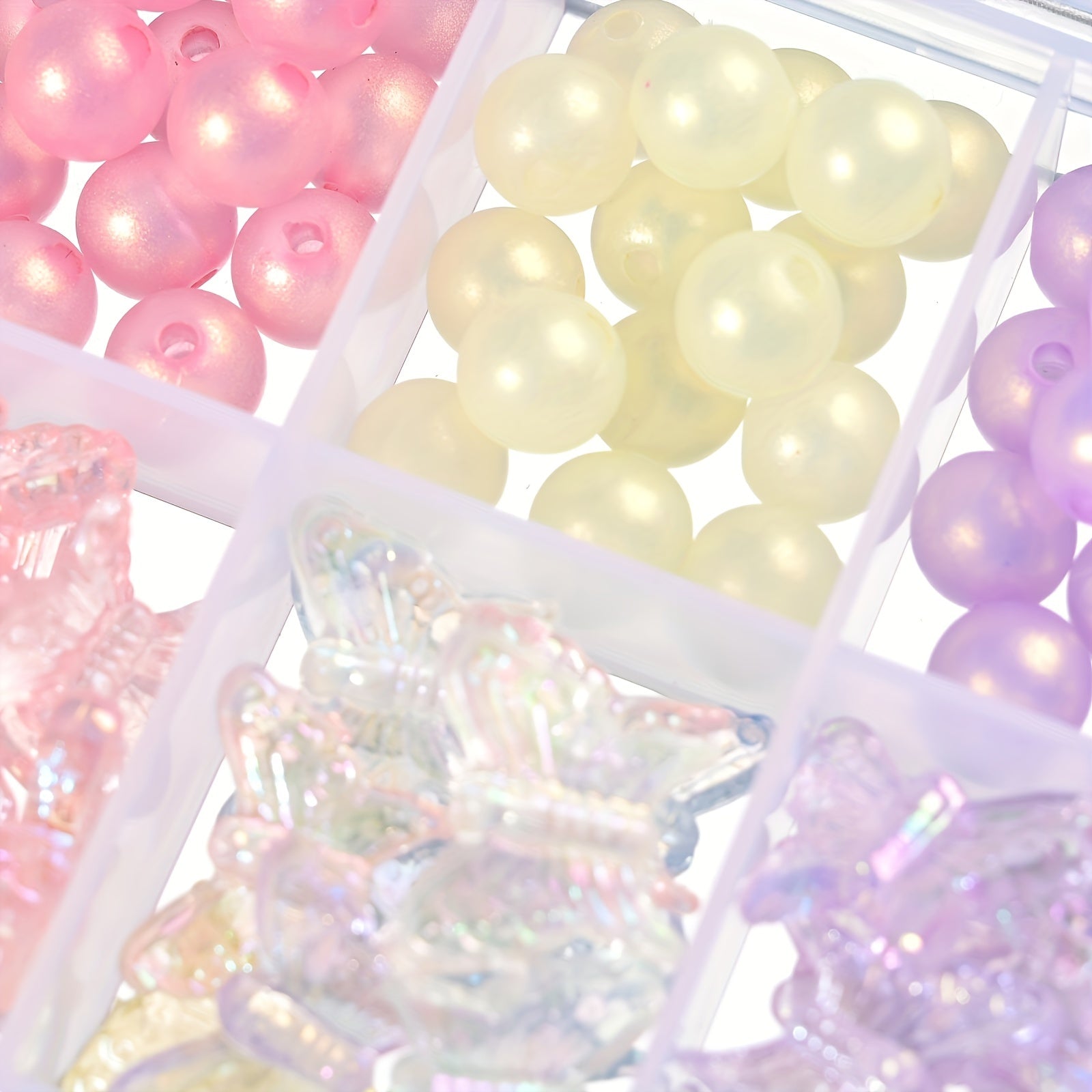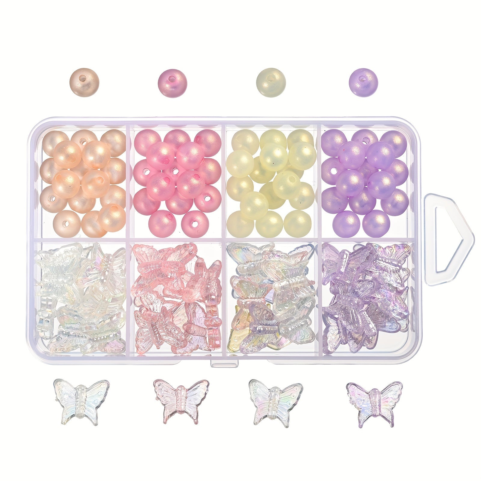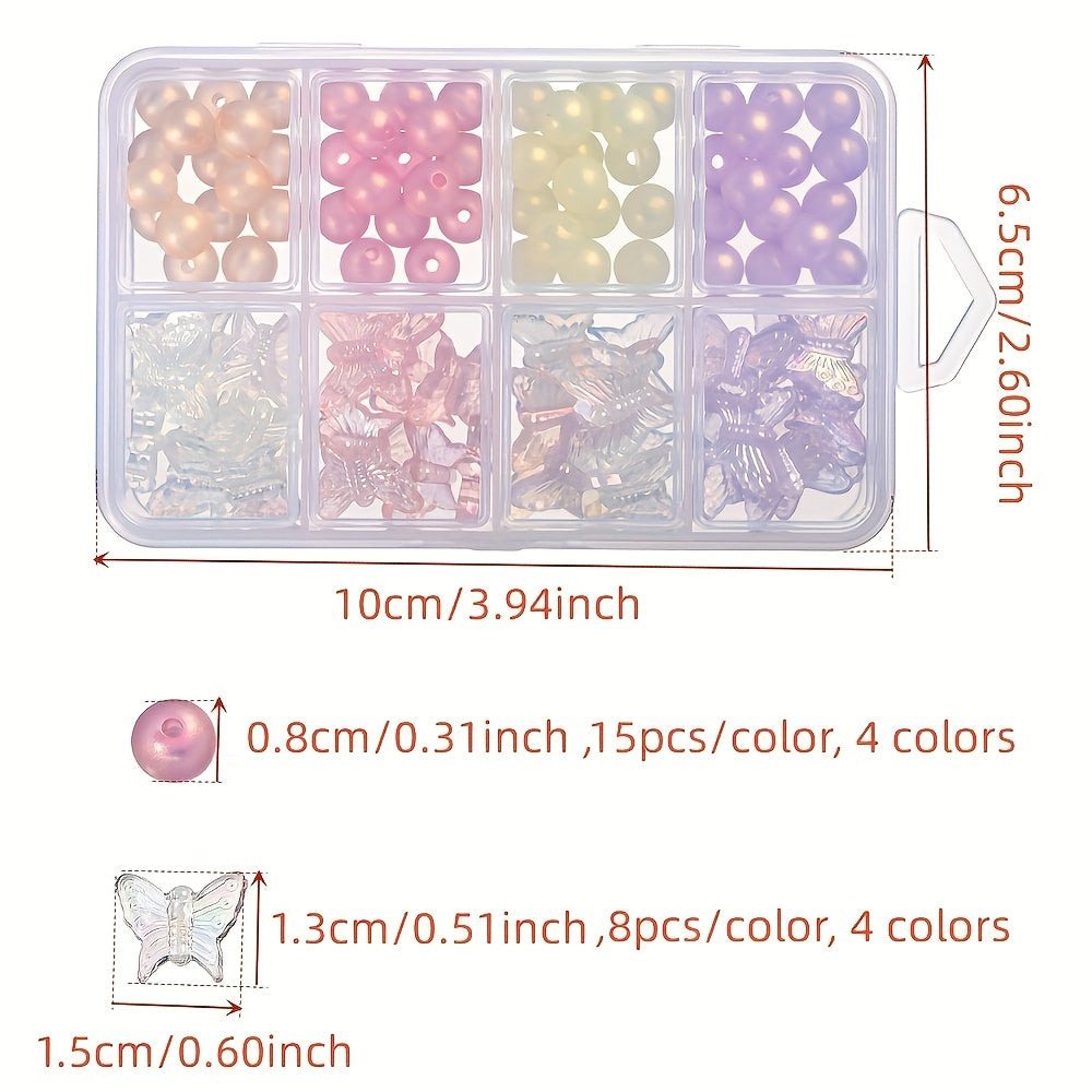This box contains 92 round acrylic beads with transparent butterfly design, perfect for creating bracelets, keychains, and phone chains.