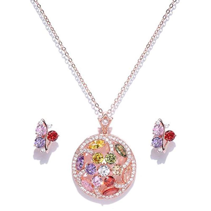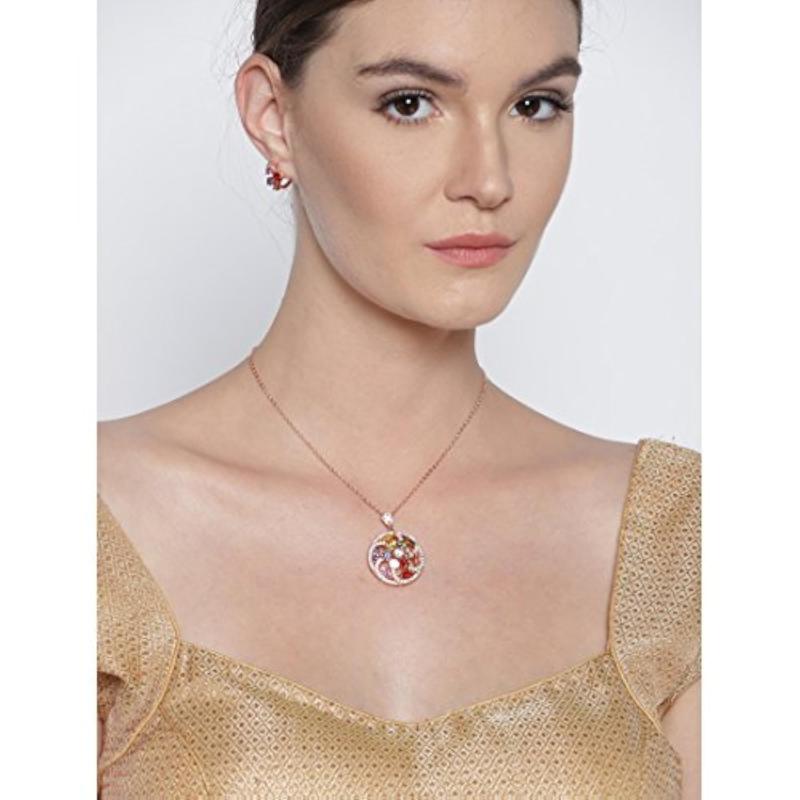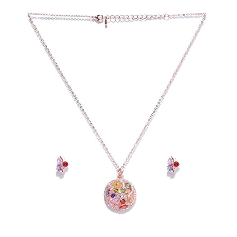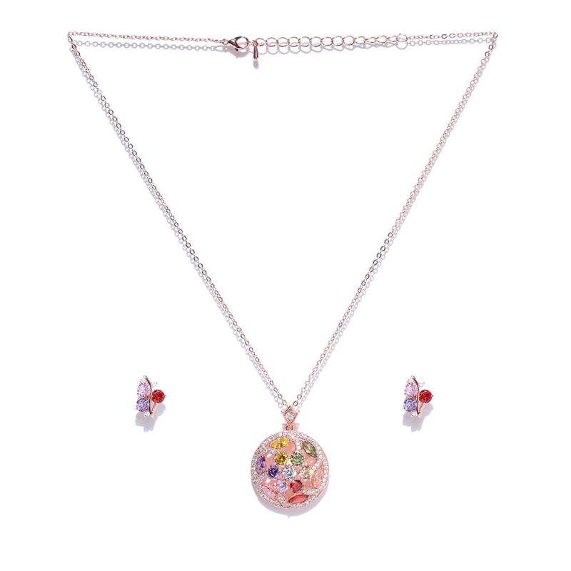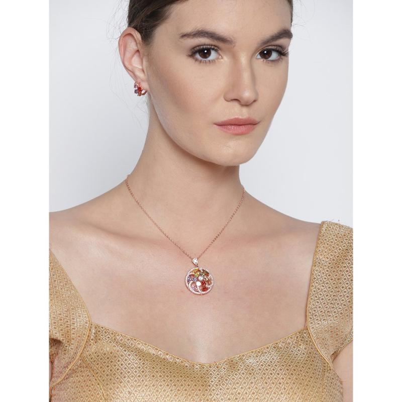 Elegant and mesmerizing pendant set crafted with AAA CZ stones in a floral design. Made with high-quality 18K rose gold plating. Perfect for special occasions.