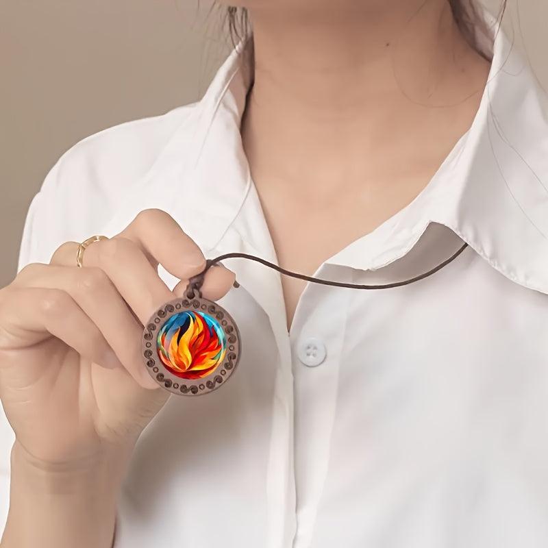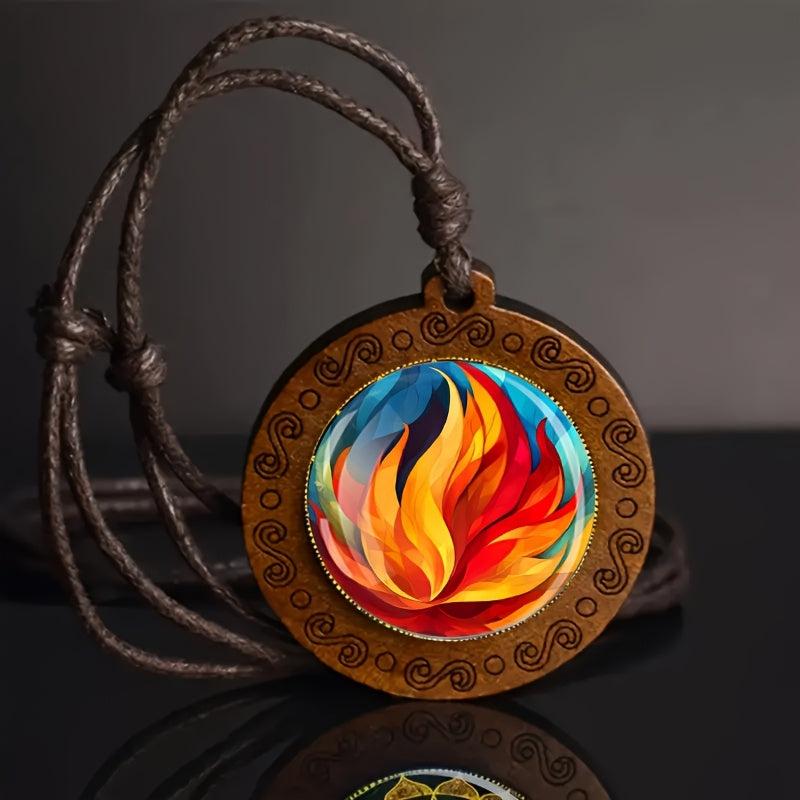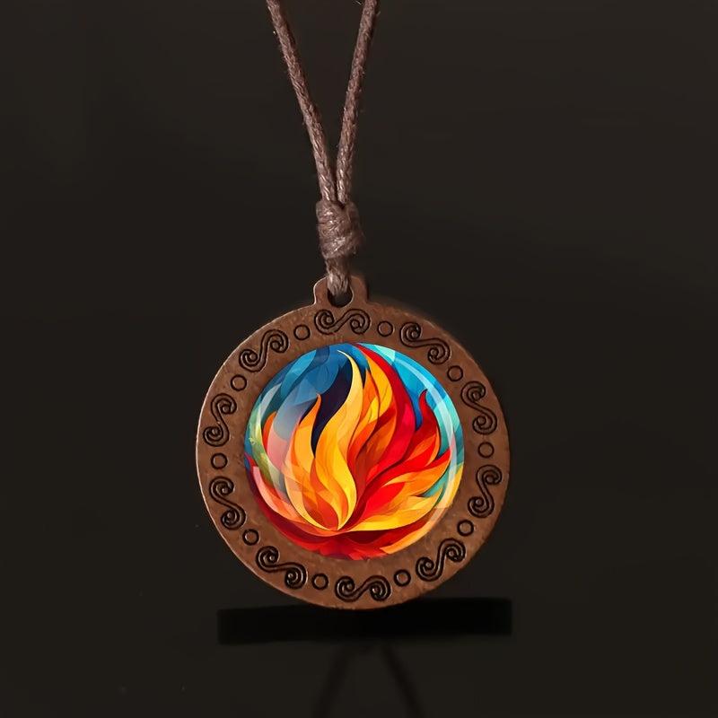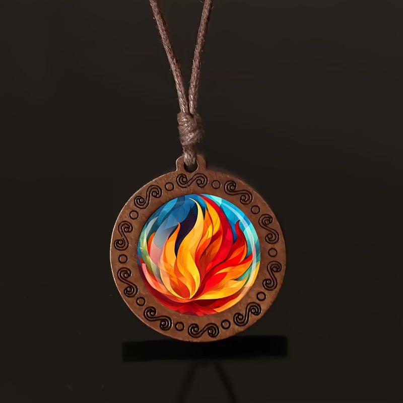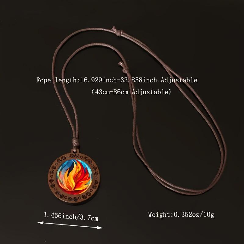 Elevate your daily wear with this unique flame pattern wooden pendant necklace featuring an adjustable rope for a bohemian style look. Makes a great gift idea for any occasion.