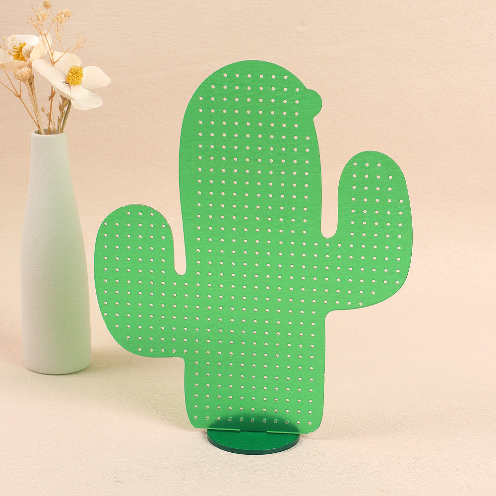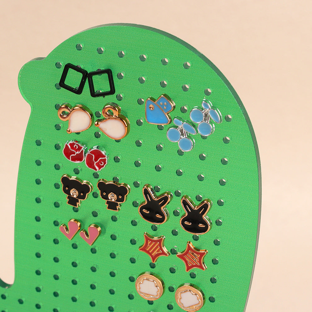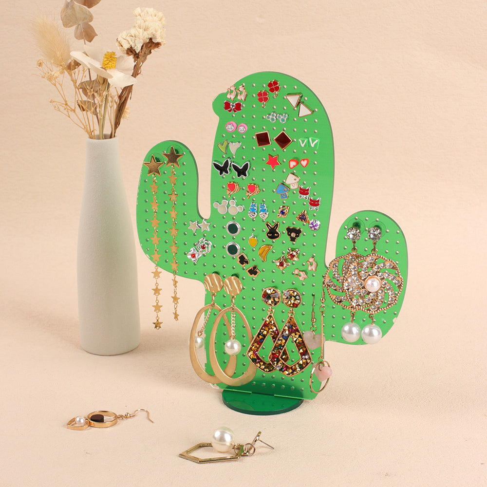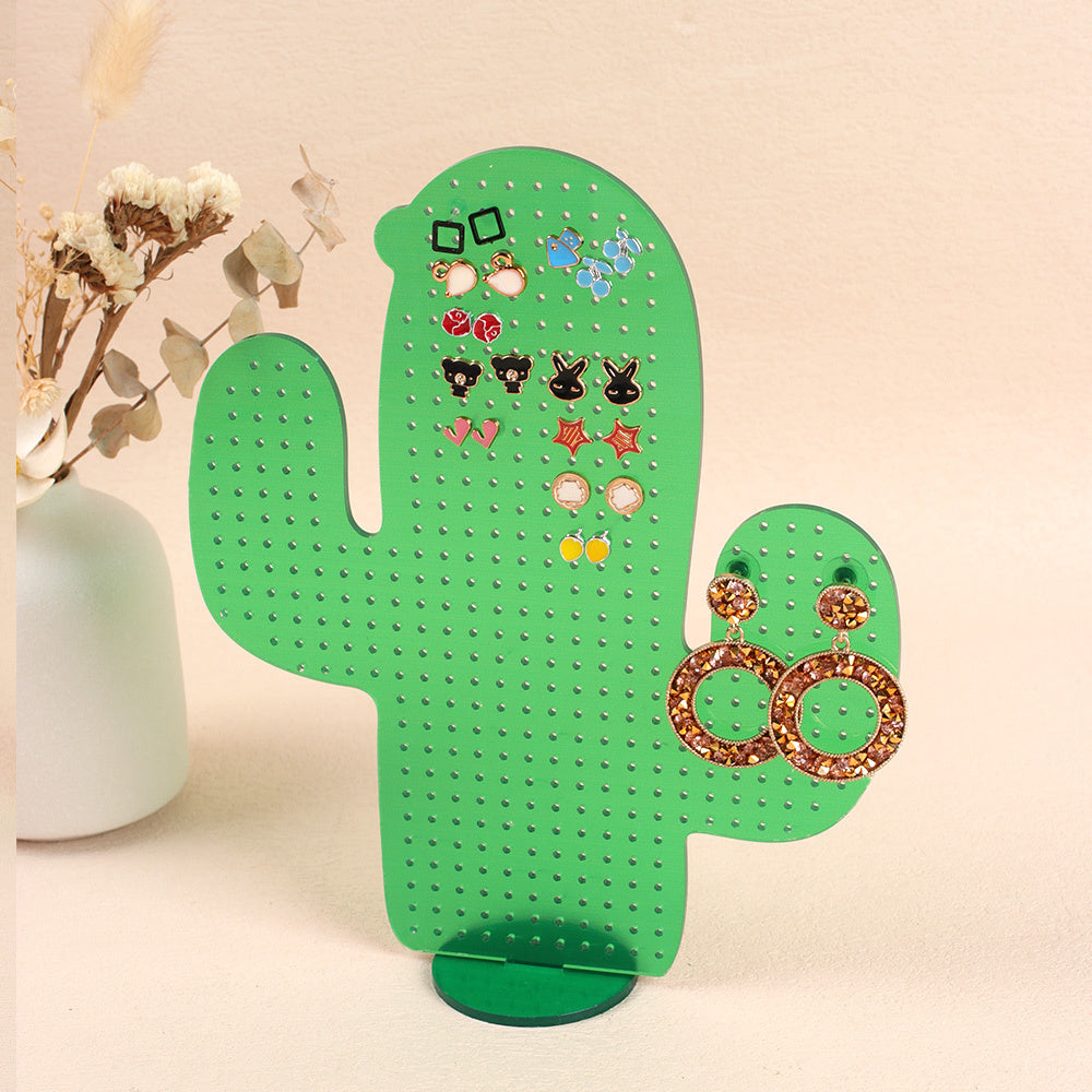 Keep your earrings organized and easily accessible with this green cactus earring holder featuring 465 holes. Perfect for displaying and storing your favorite earrings.