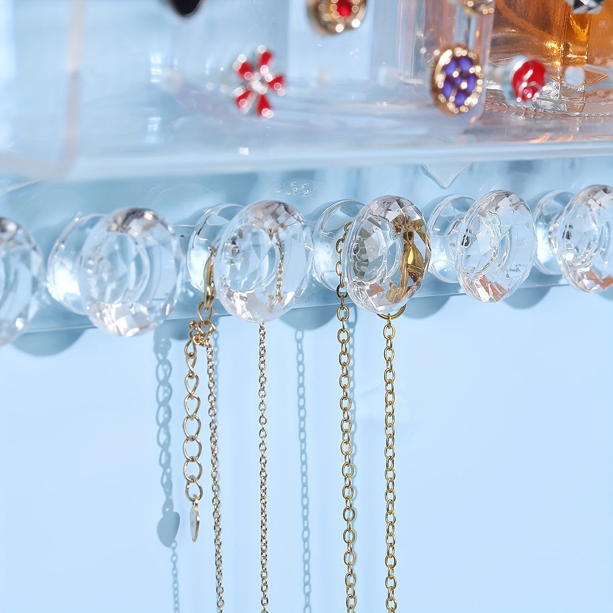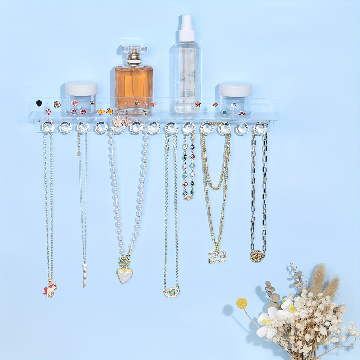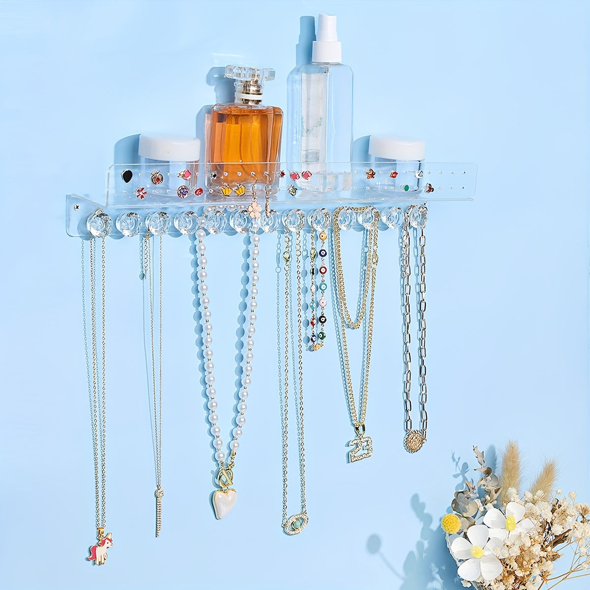 Keep your jewelry organized and displayed in style with this acrylic wall hanging jewelry organizer. It features 13 hooks for storing earrings, necklaces, and bracelets, allowing you to easily find and access your favorite pieces.