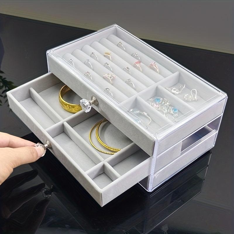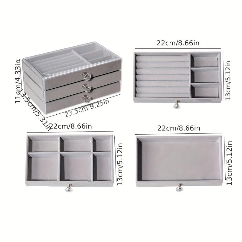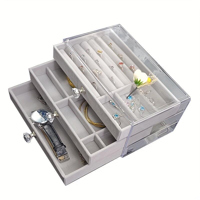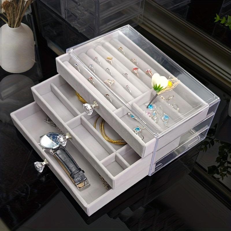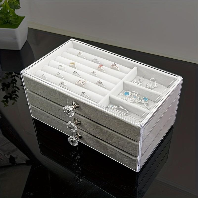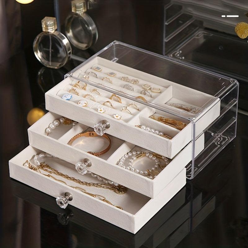 Keep your jewelry organized and safe with this elegant acrylic storage box. Features 3 drawers and 3 layers of flannelette lining for secure storage of earrings, rings, and other jewelry items.