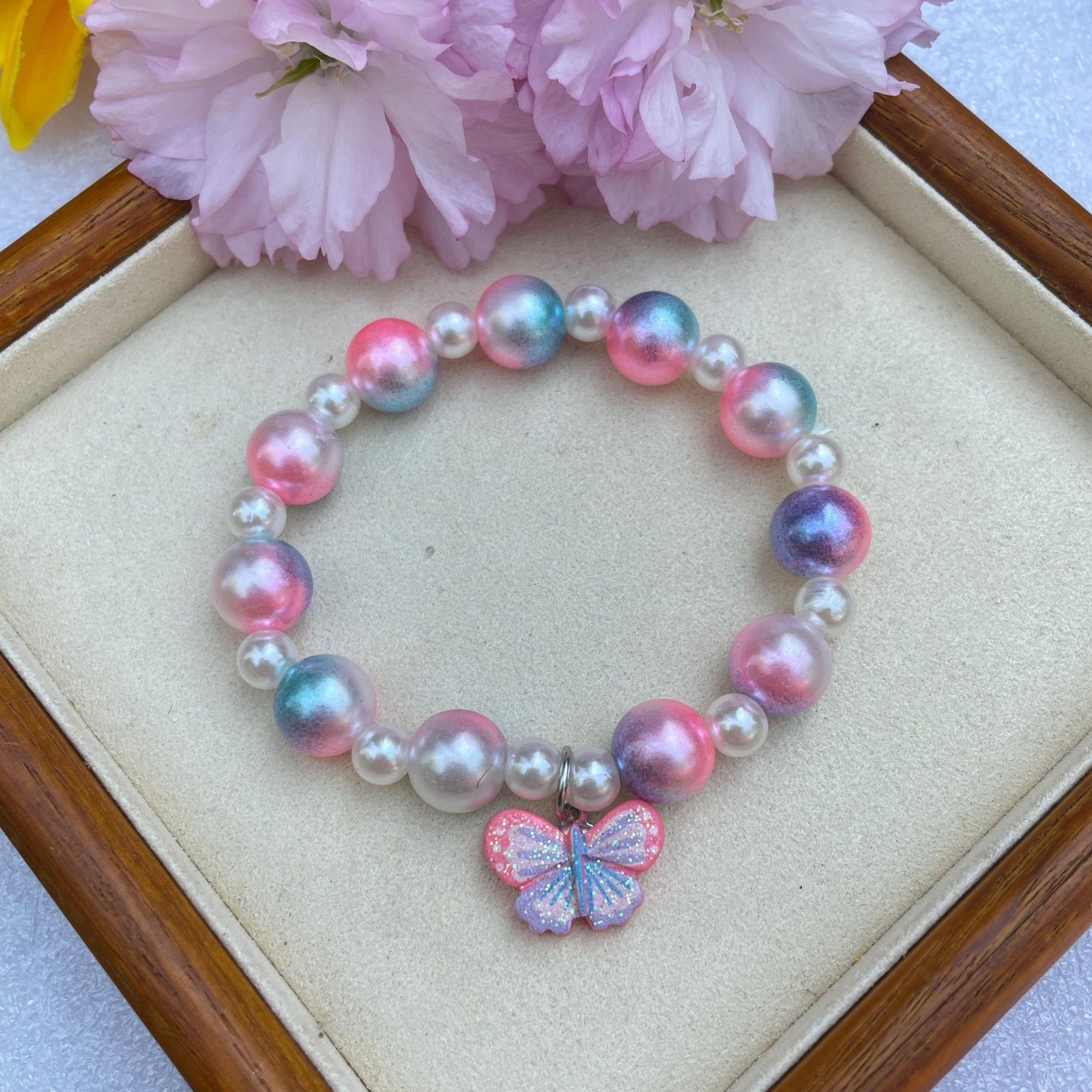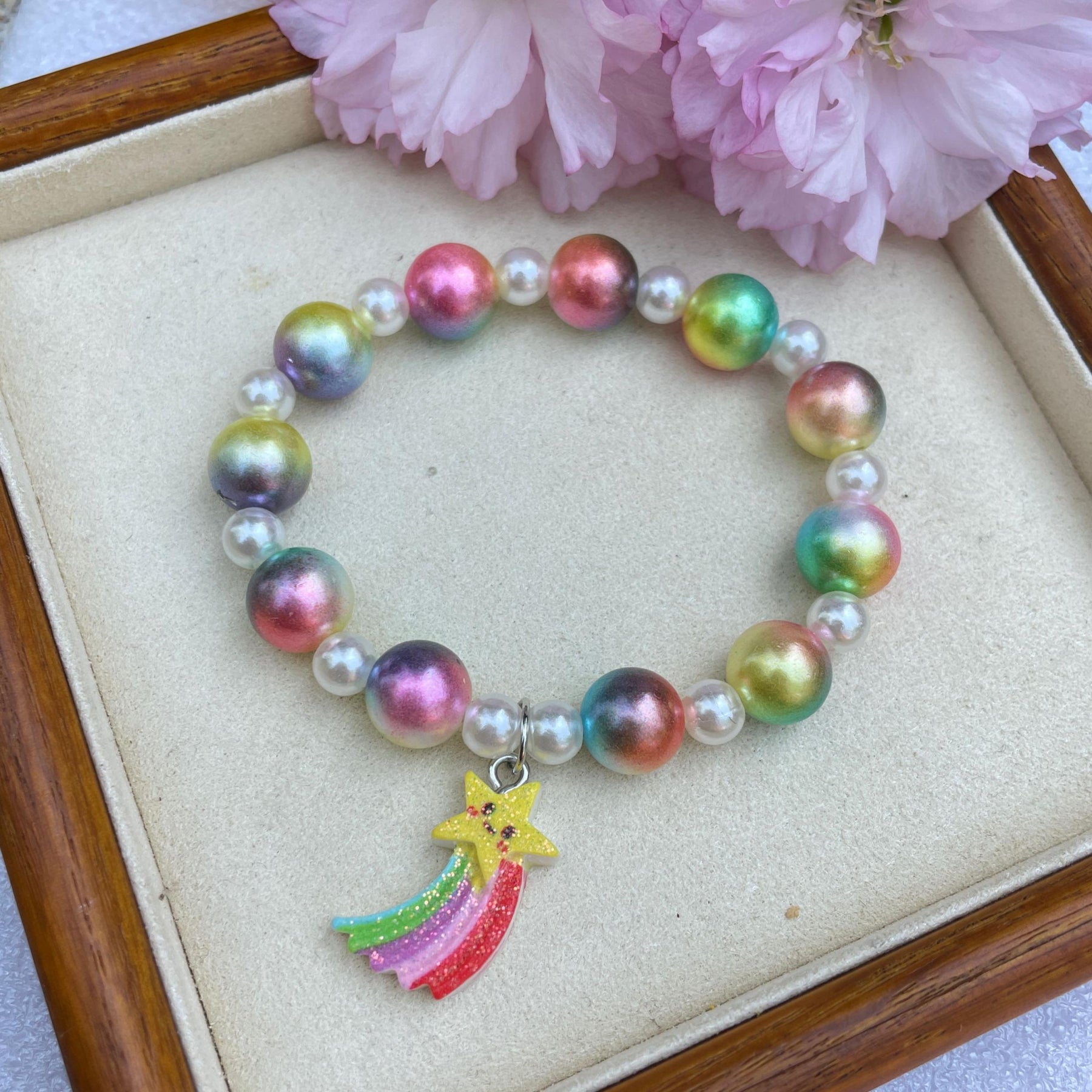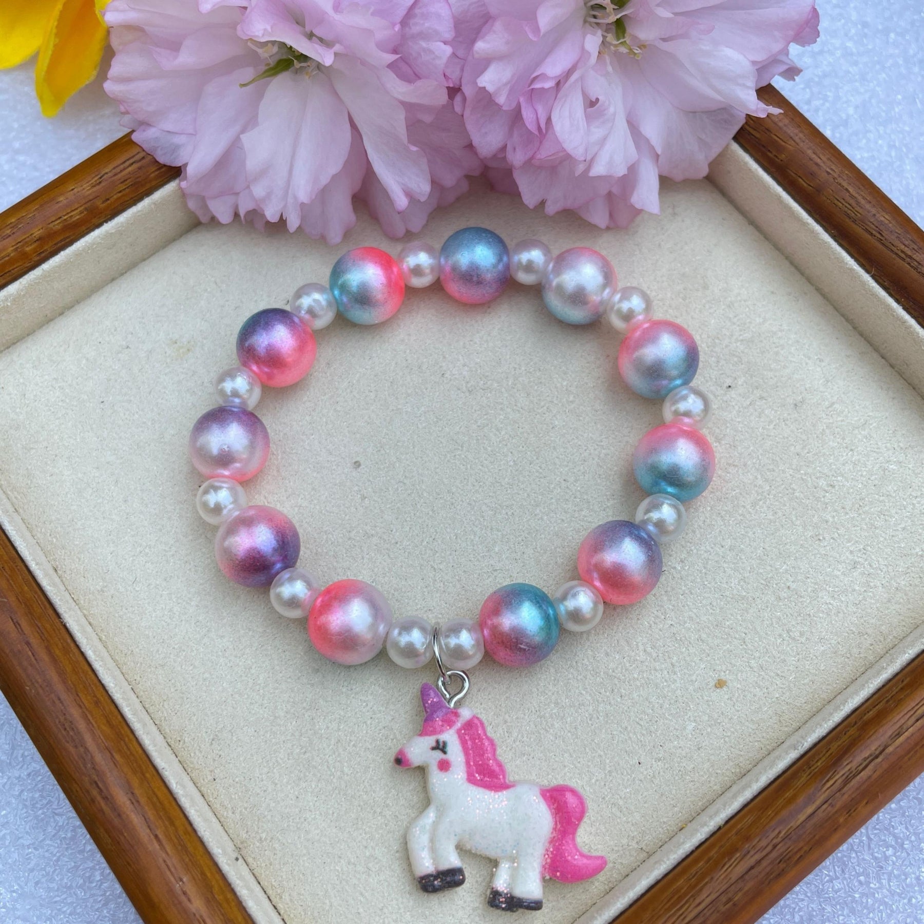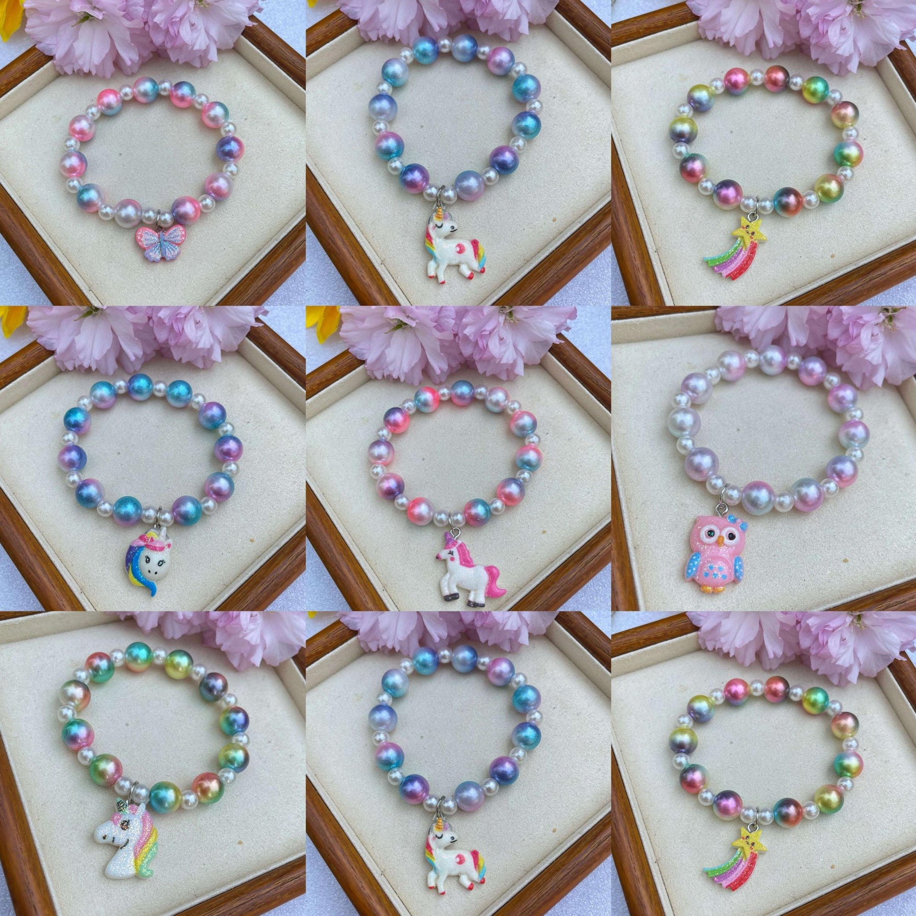 This adorable bracelet features cartoon unicorn and owl designs, made of acrylic material with pearl accents. Perfect for kids.