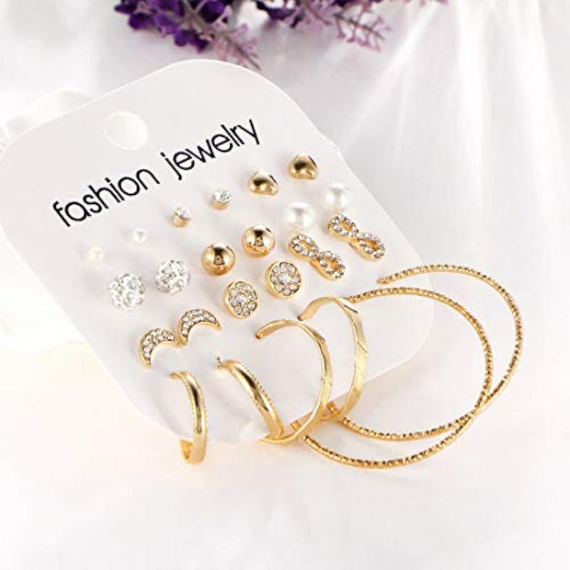 Get this stunning set of 9 pairs of earrings featuring the latest AD plated designs. Perfect for any occasion, these earrings will add a touch of elegance to your look.
