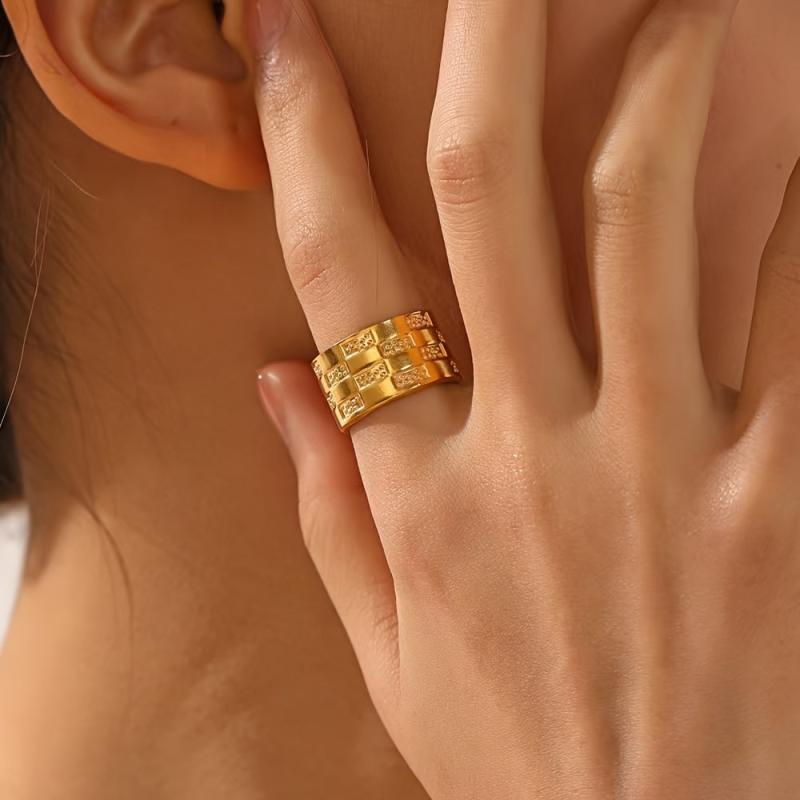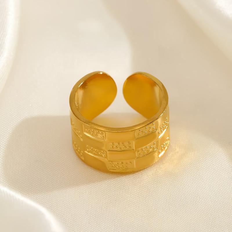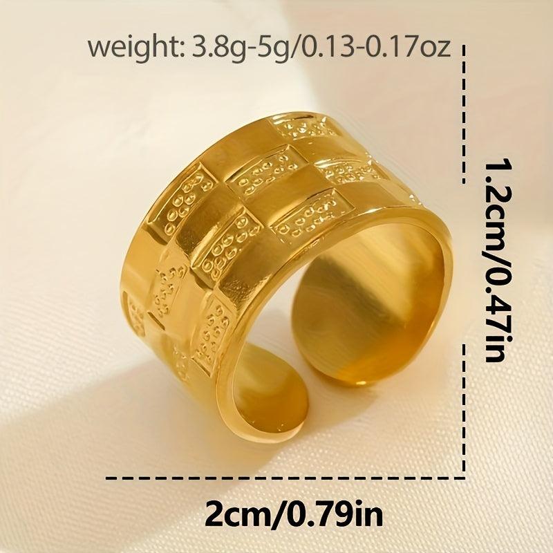 This adjustable stainless steel wide band ring features a bold textured golden tone finish, making it perfect for casual attire or gifting. It is a versatile everyday accessory.