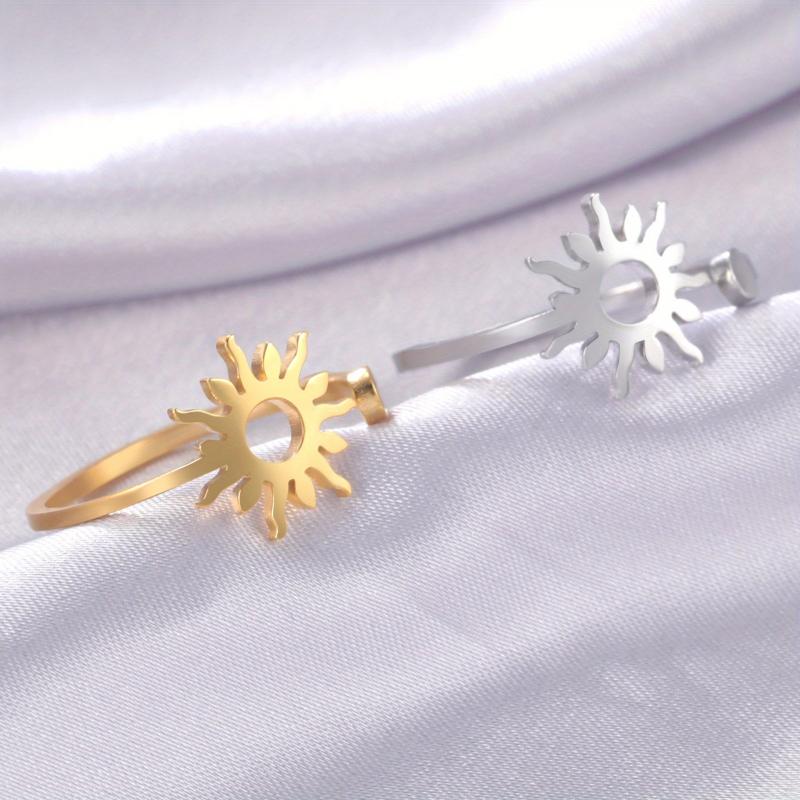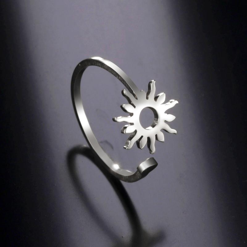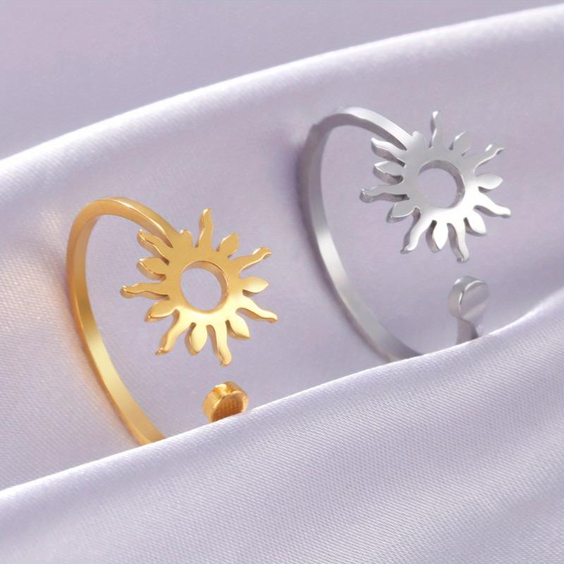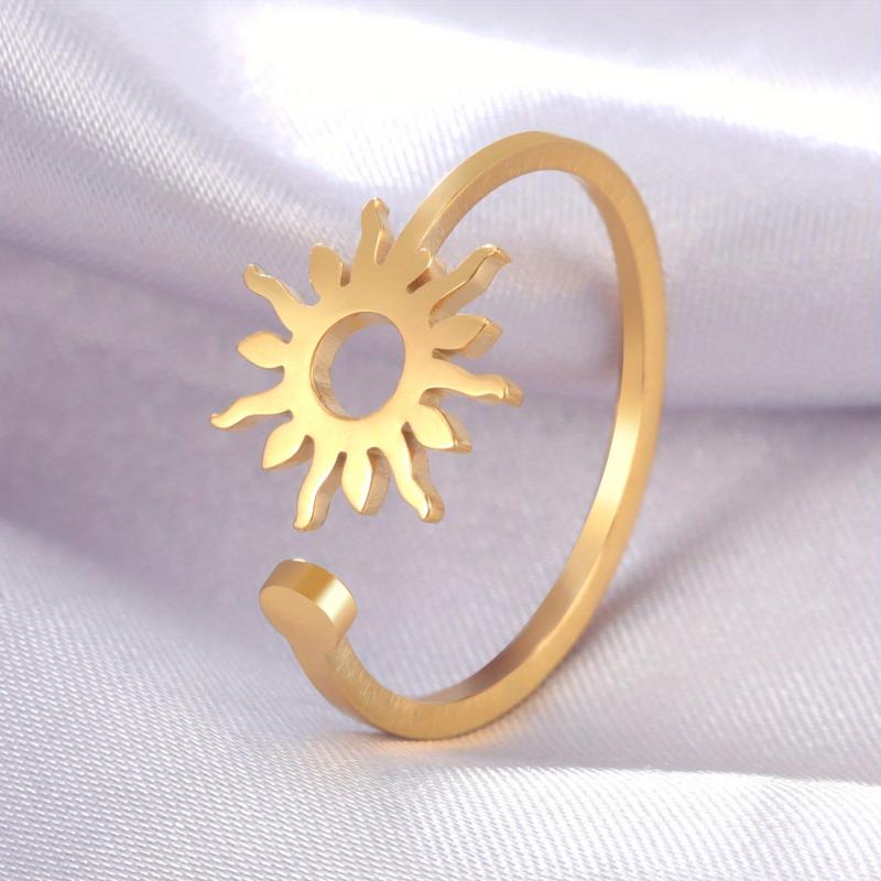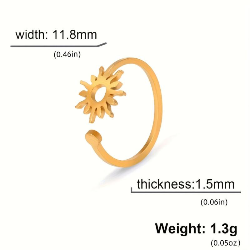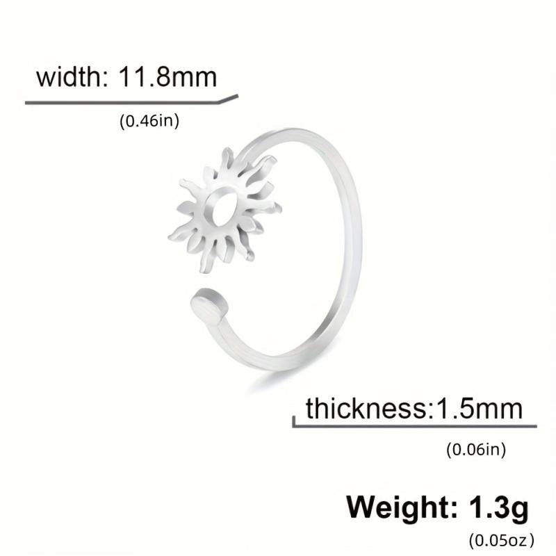 This adjustable sunburst ring features a sun motif design, perfect for men and women. Made of stainless steel, it is a minimalist and stylish piece of unisex jewelry. Ideal as a gift for birthdays or special occasions.
