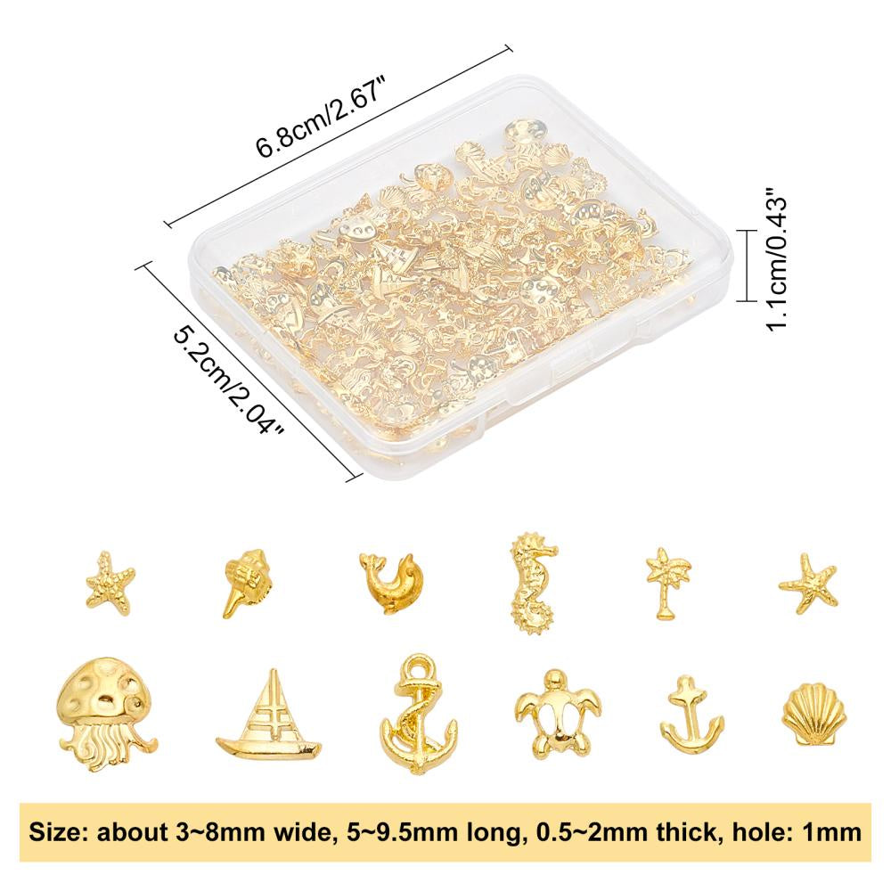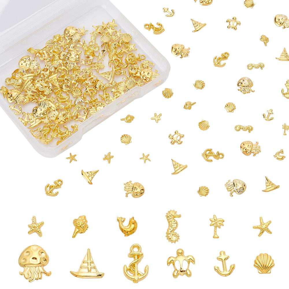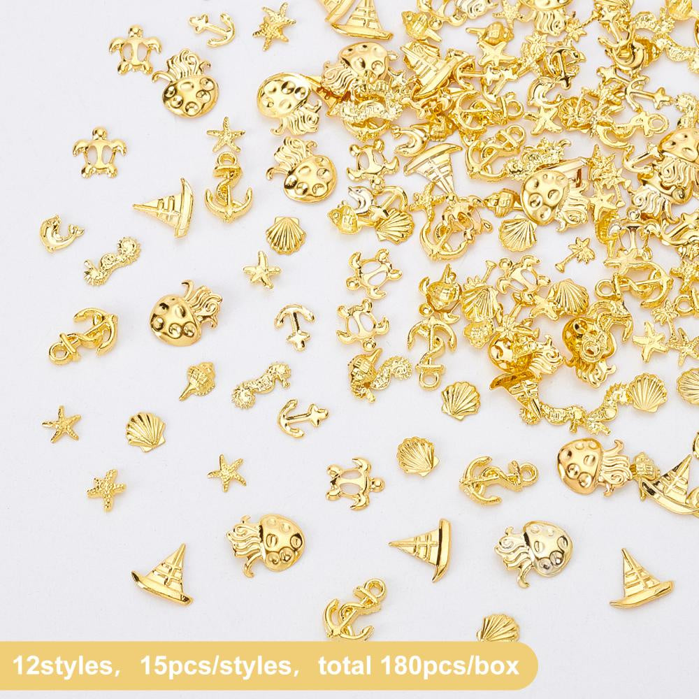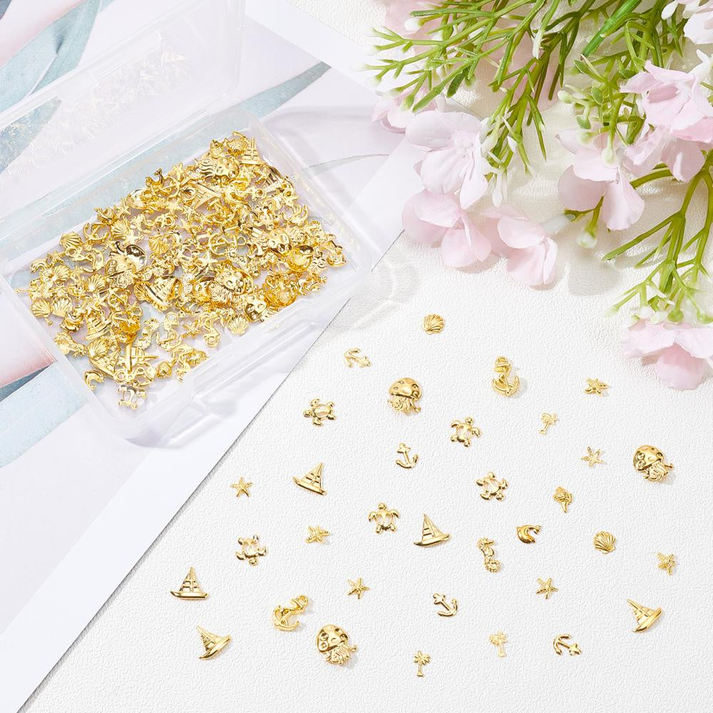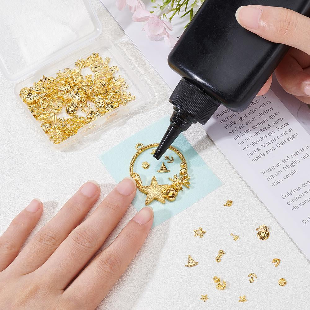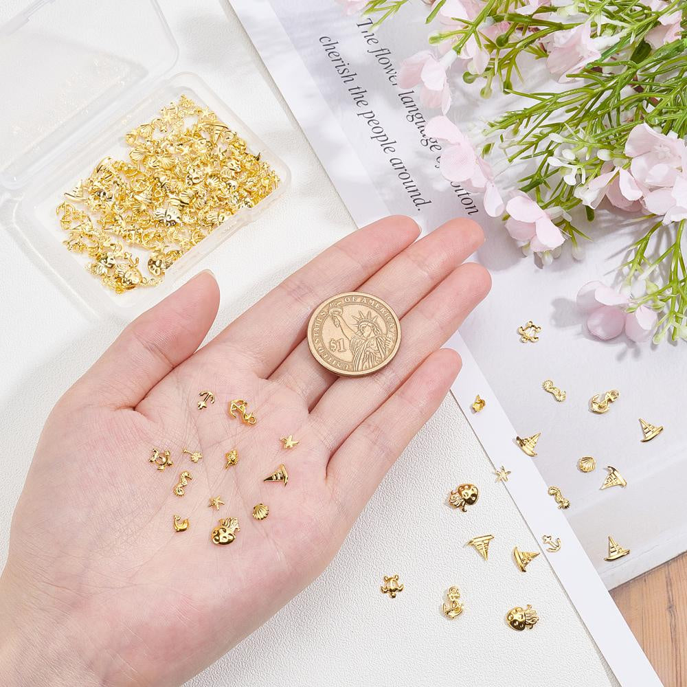 This set includes 176pcs of golden alloy cabochons with various shapes, perfect for filling and decorating resin jewelry creations. Ideal for DIY enthusiasts and crafters.