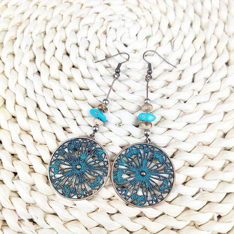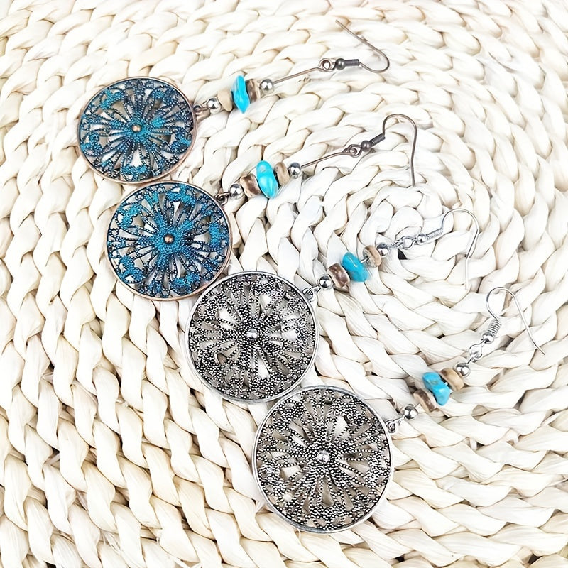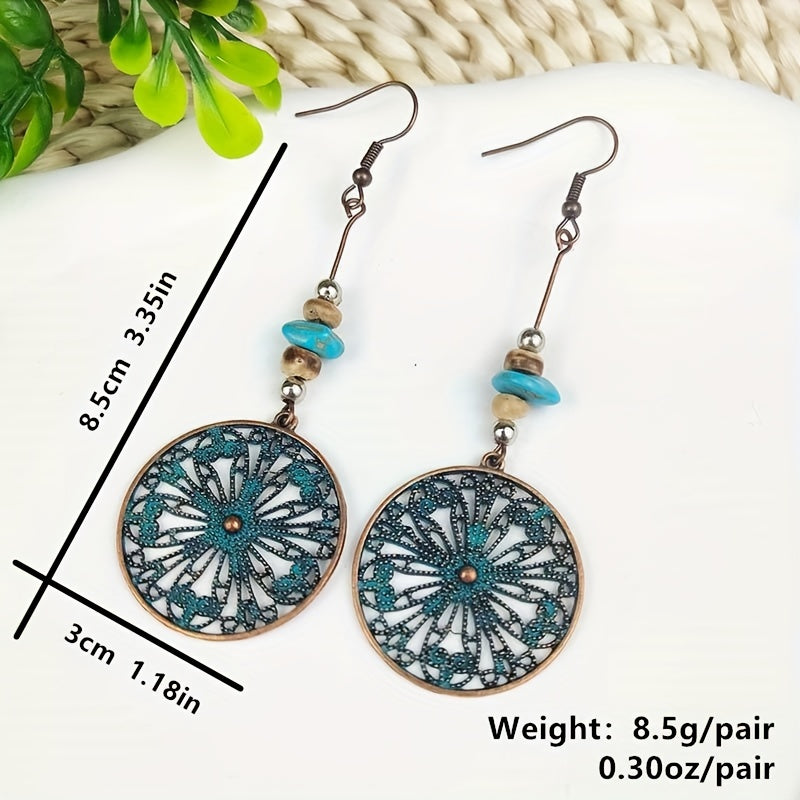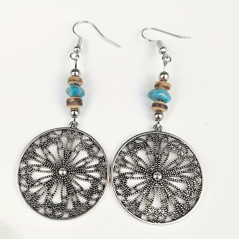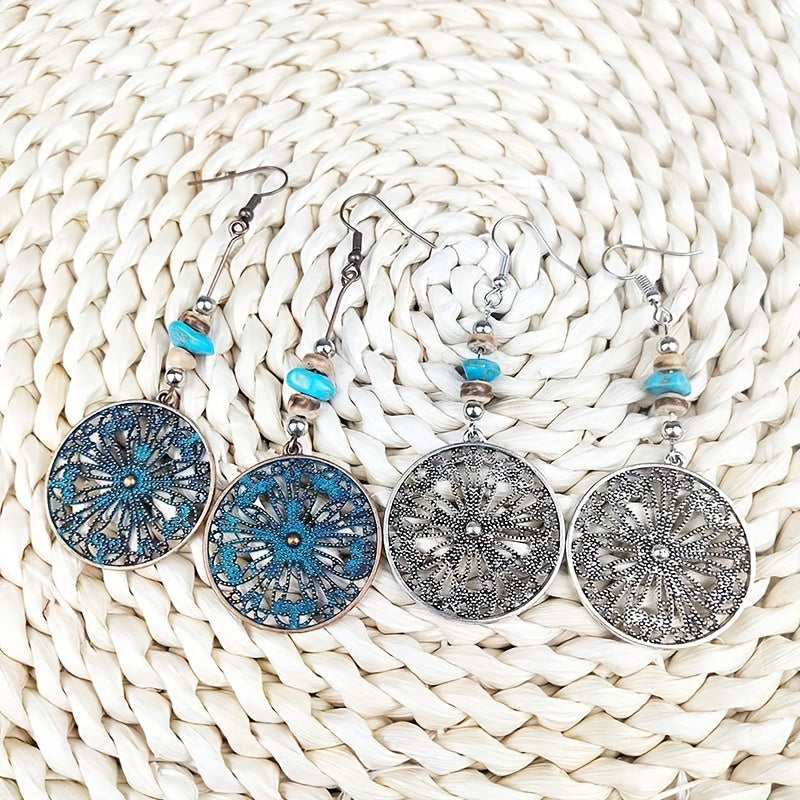 Get these stunning earrings with intricate alloy carved hollow flower design and stone pendant. Perfect for adding a touch of elegance to your outfit.