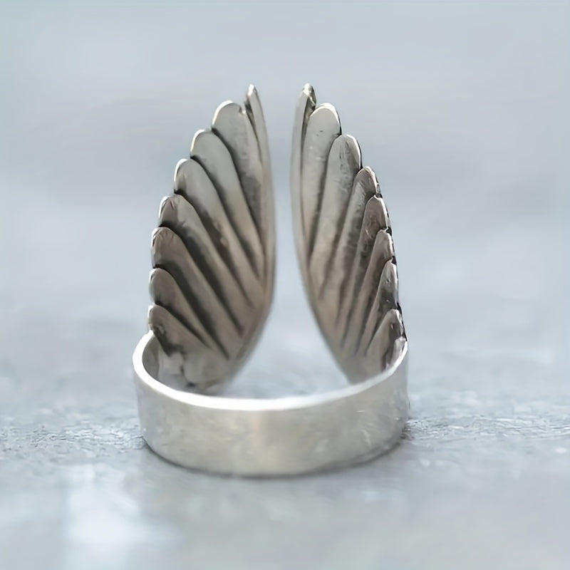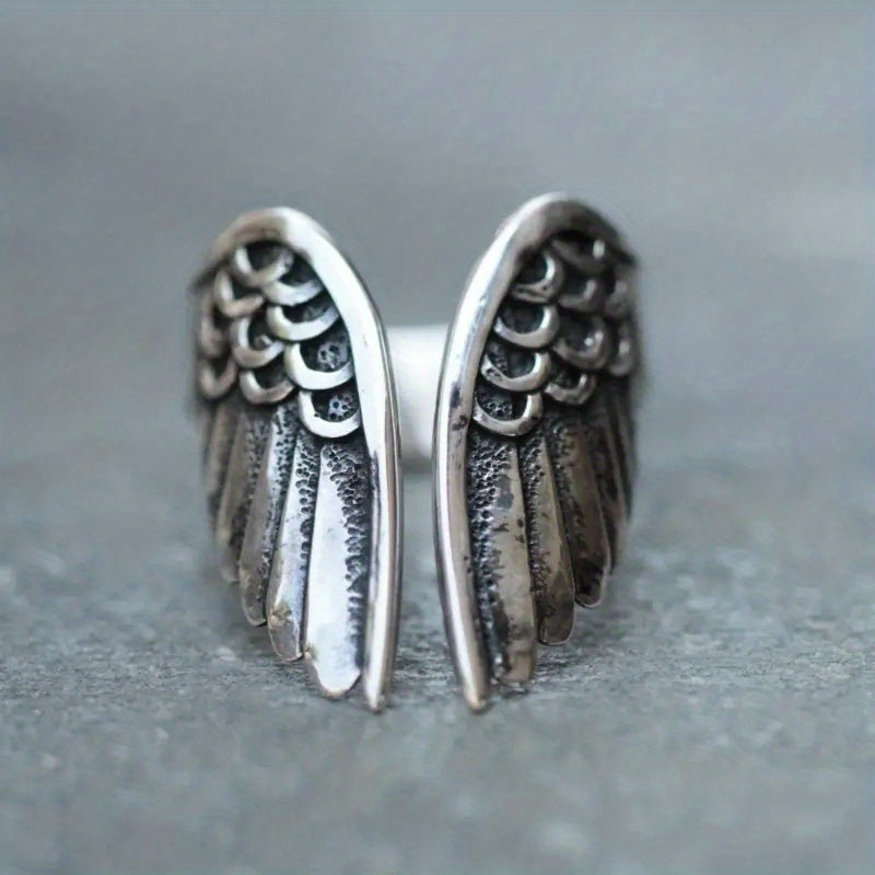 This open ring features a retro design with angel wings, perfect for men. Made of alloy with dyed finish.