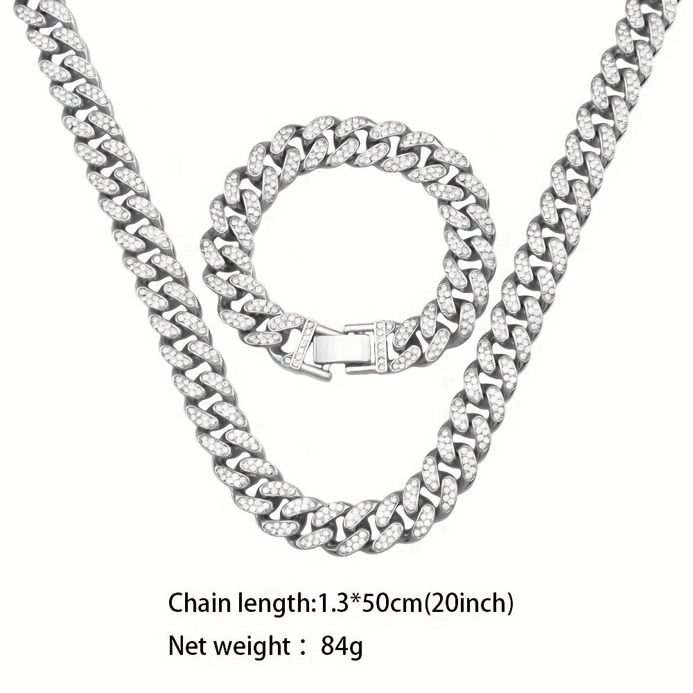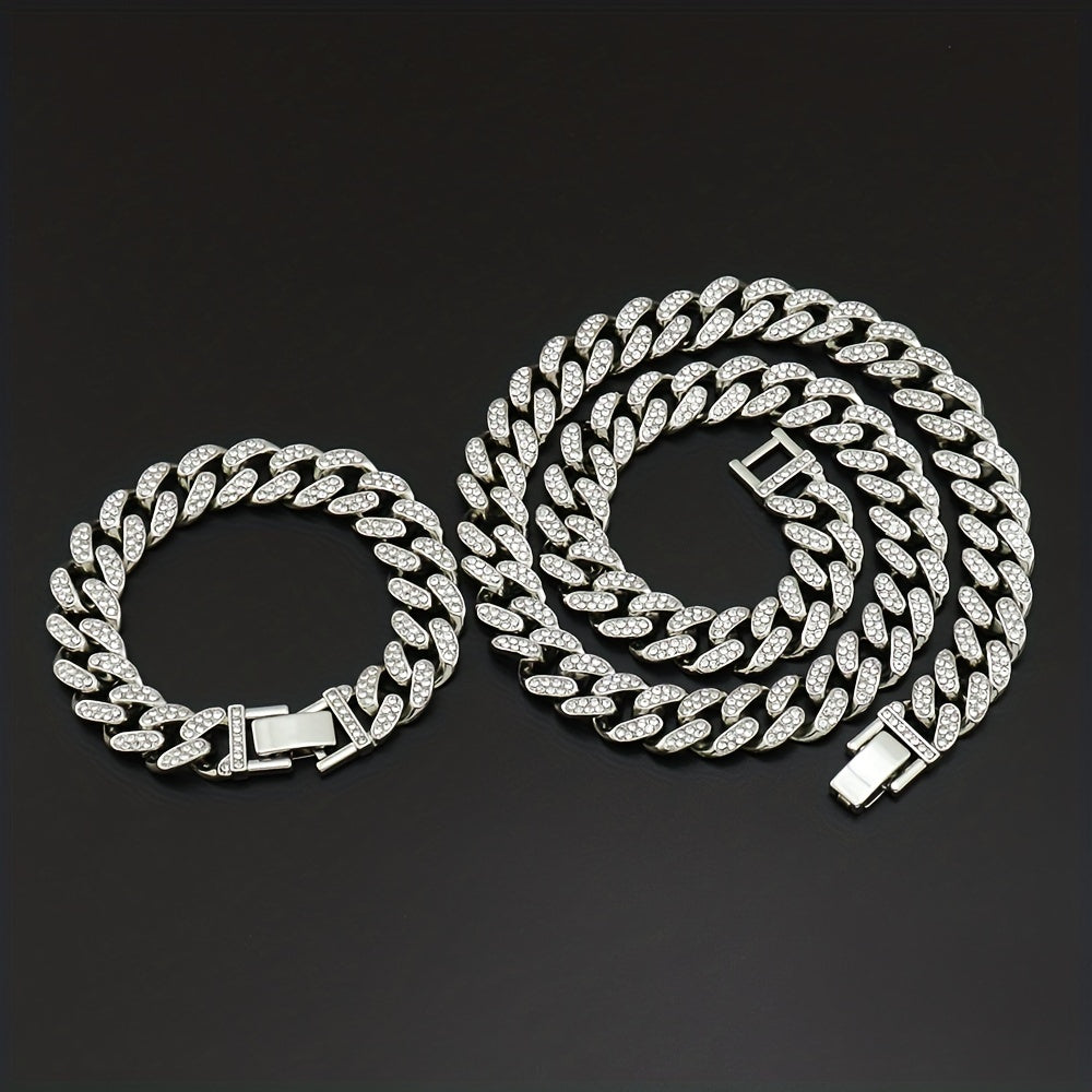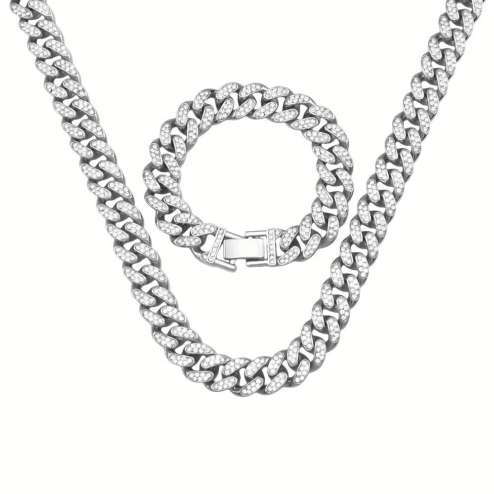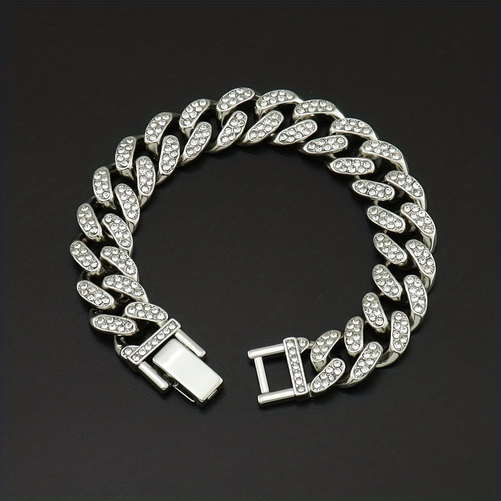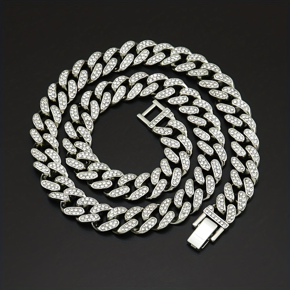 This stylish alloy necklace features a flat buckle and full rhinestone design on a Cuban chain. Perfect gift for men, couples or women.