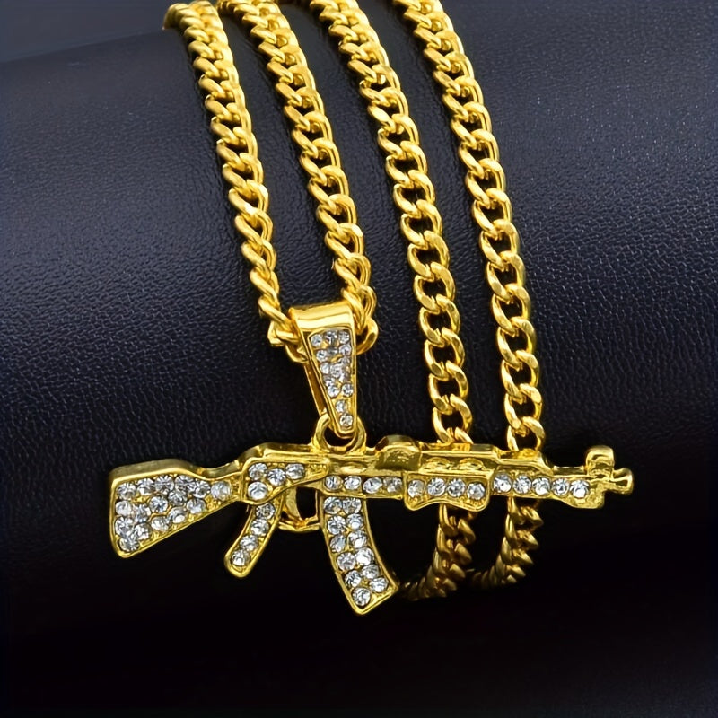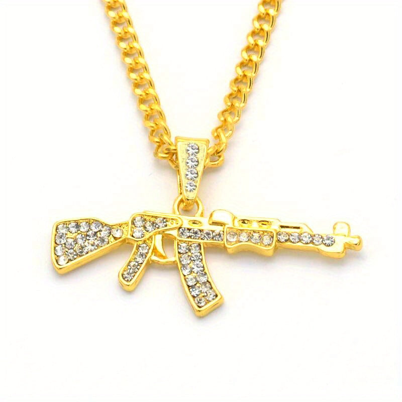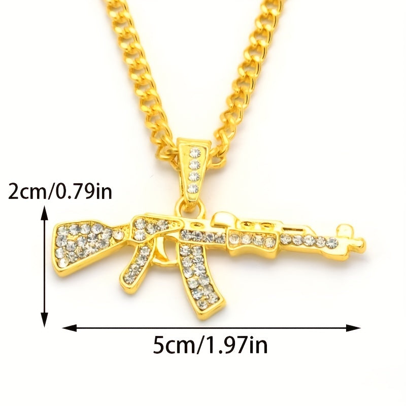 This creative necklace features a submachine gun pendant adorned with artificial diamonds. Perfect for adding a unique touch to your hip hop style.