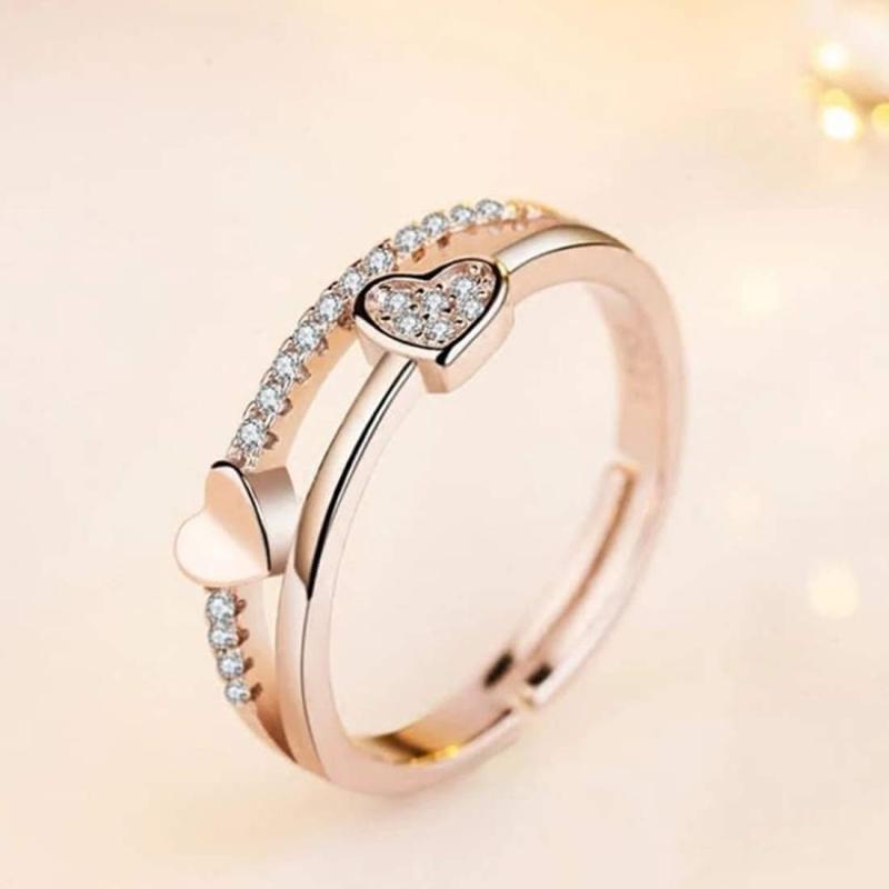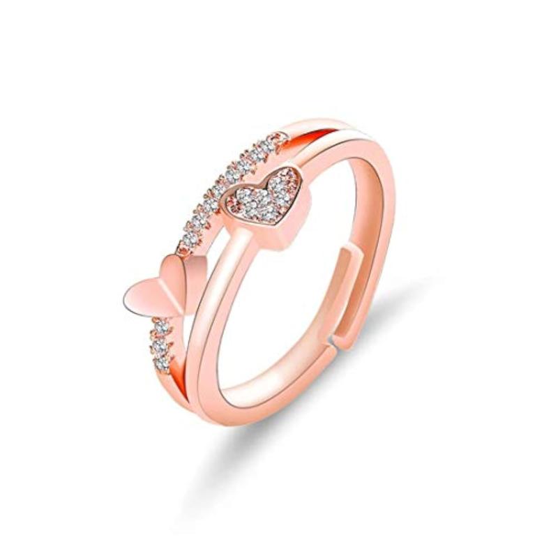 Show your love with this adorable heart-shaped ring featuring American diamond accents. The rose plated design adds a touch of elegance to any outfit.