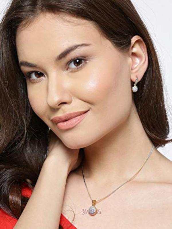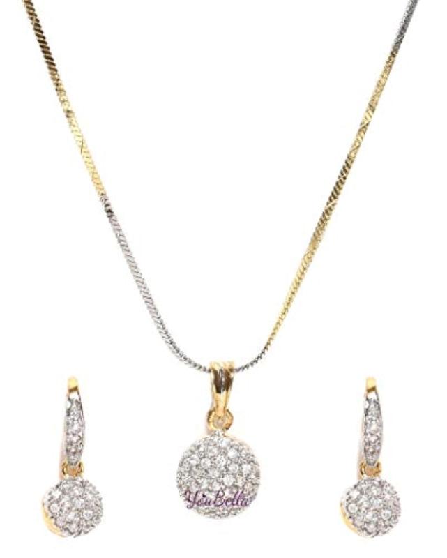This elegant necklace set features a stunning pendant with American diamond plating. Perfect for girls and includes matching earrings and a Rakhi.