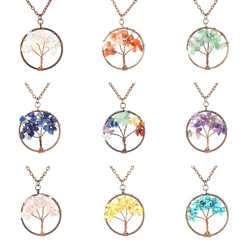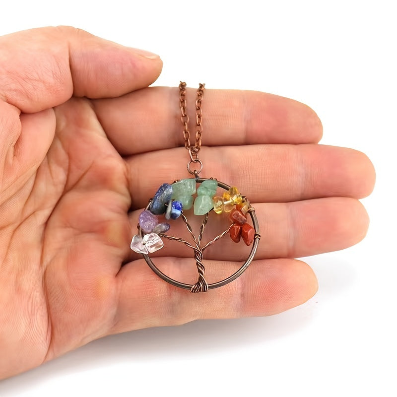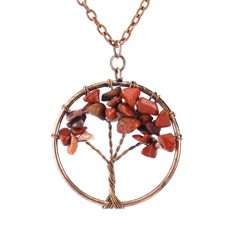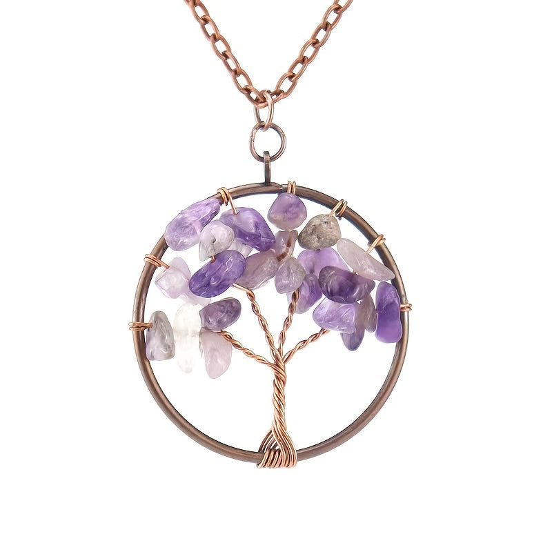 This stunning necklace features natural crushed Amethyst crystal stones with an antique red copper tree of life pendant. A beautiful and unique piece that can be worn for any occasion.