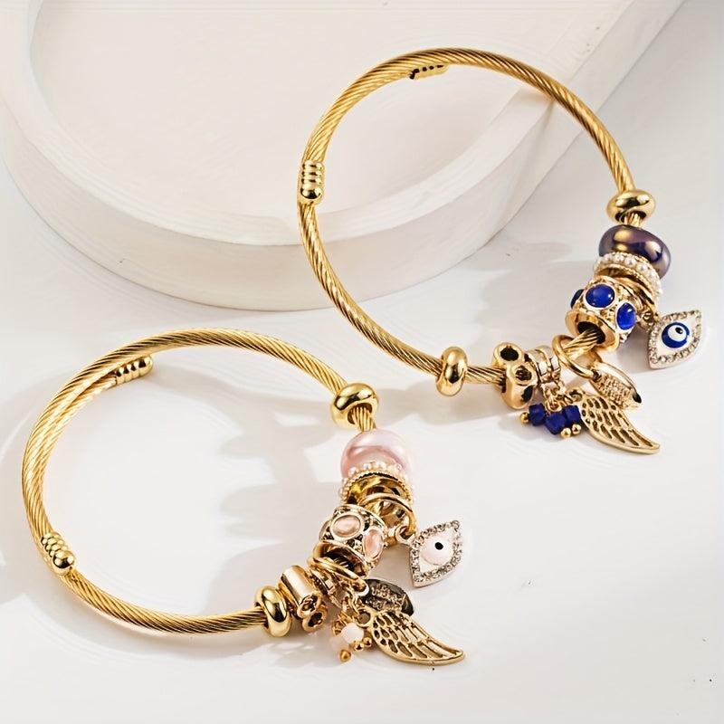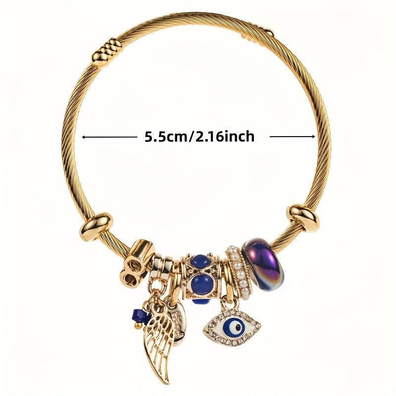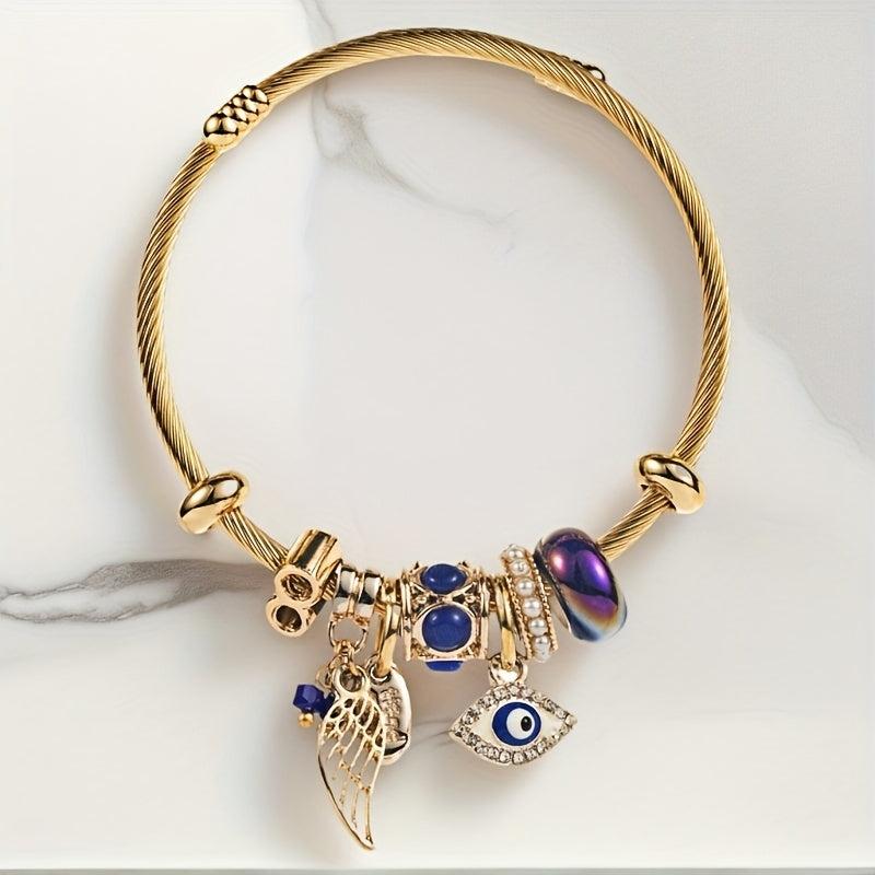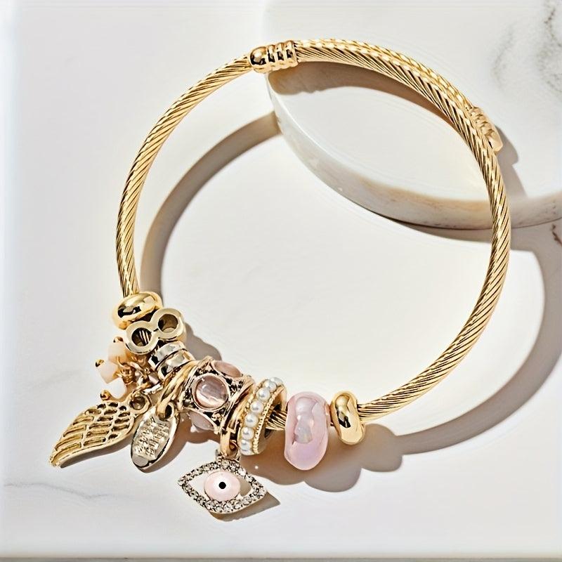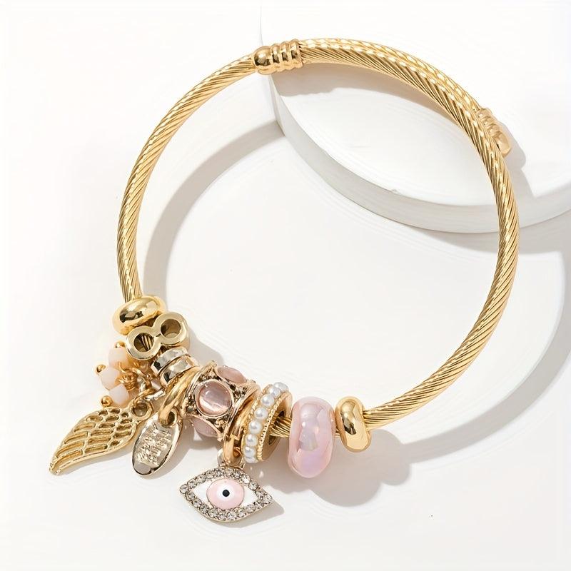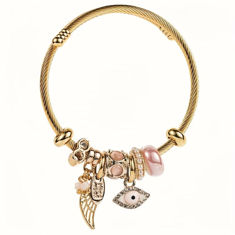 Add a touch of mystique with this charming bracelet featuring angel and demon eye charms, accented with crystals, pearls, and rhinestones. Perfect for daily wear and special occasions.