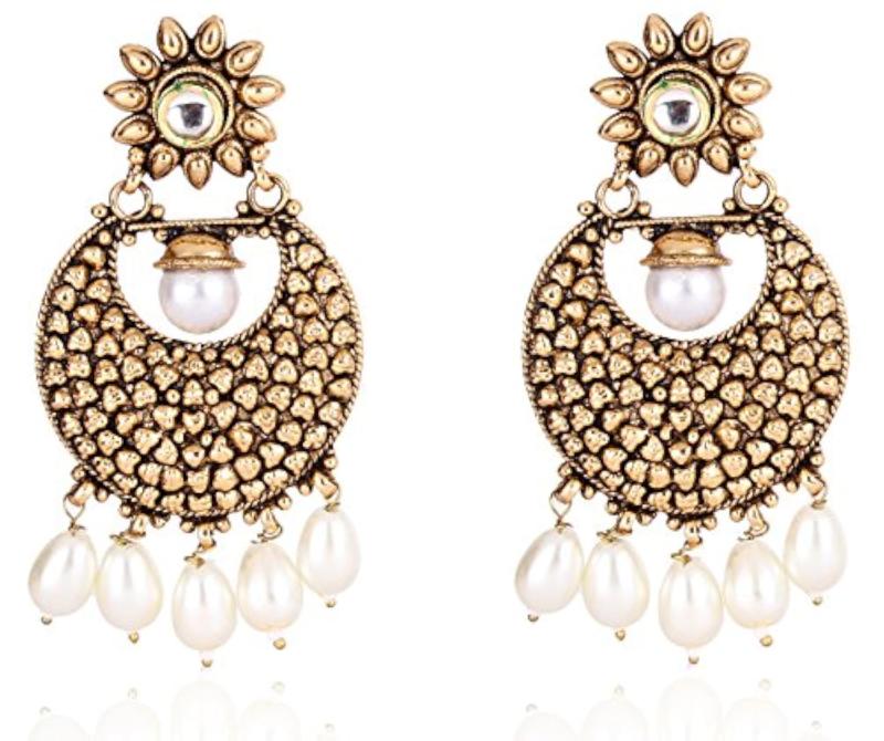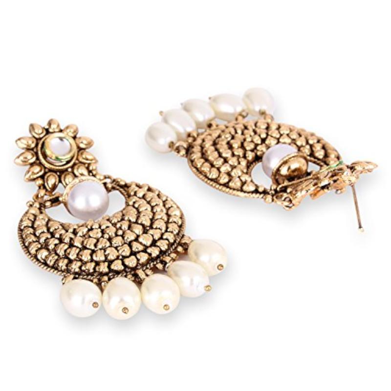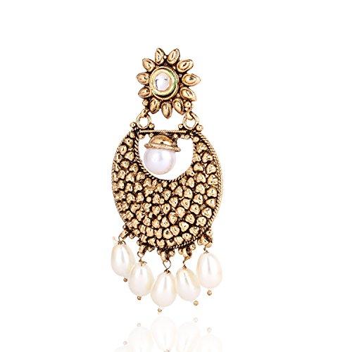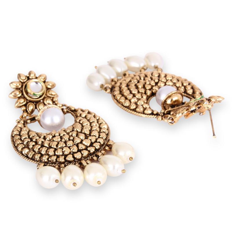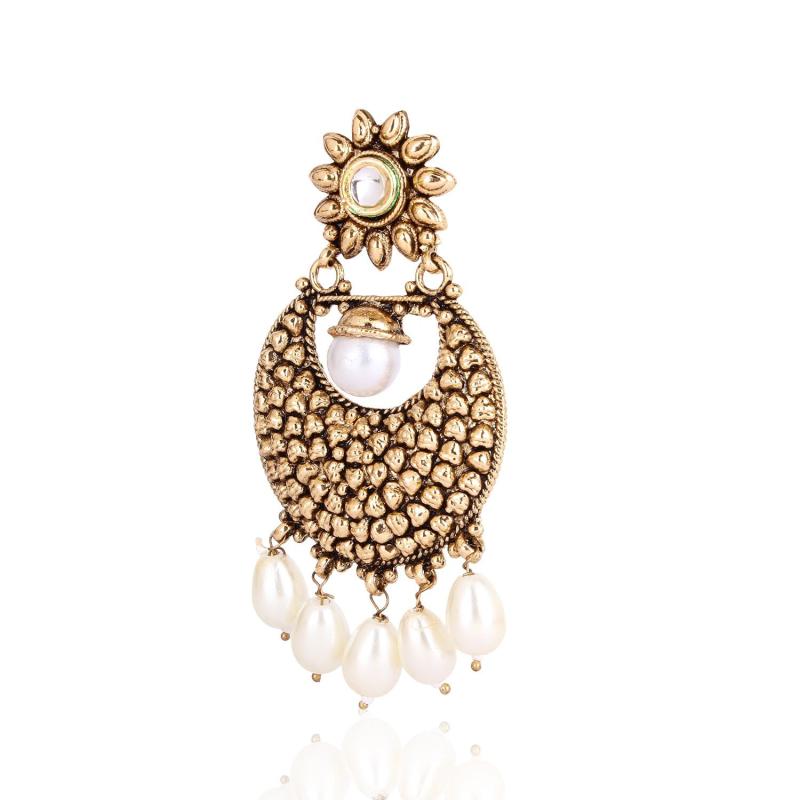 Add a touch of elegance to your ensemble with these antique plated copper earrings featuring Kundan and pearl drops. Perfect for special occasions or everyday wear.