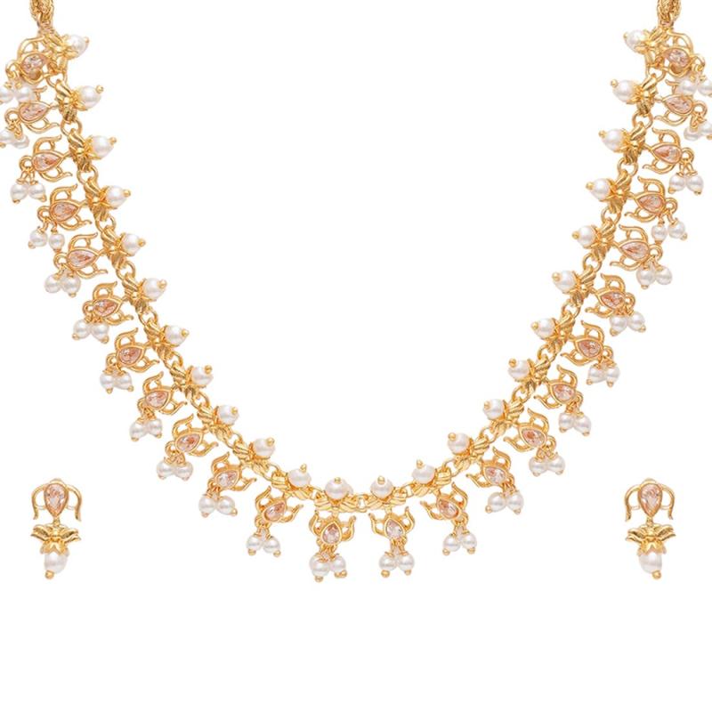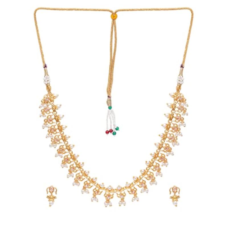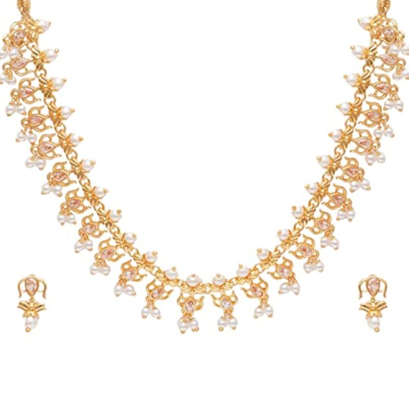 Elegant antique-inspired brass jewellery set adorned with faux pearls for a timeless look.